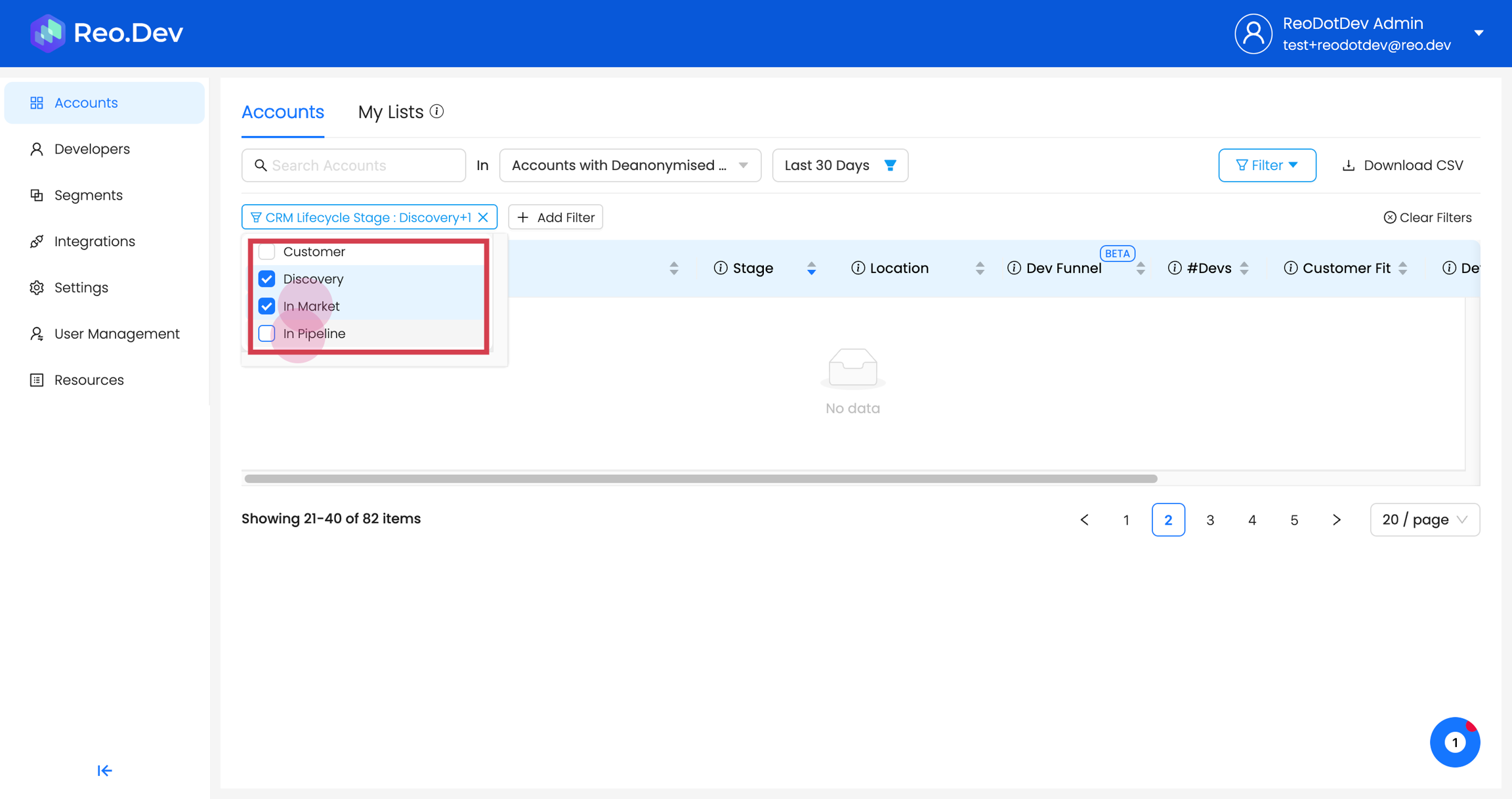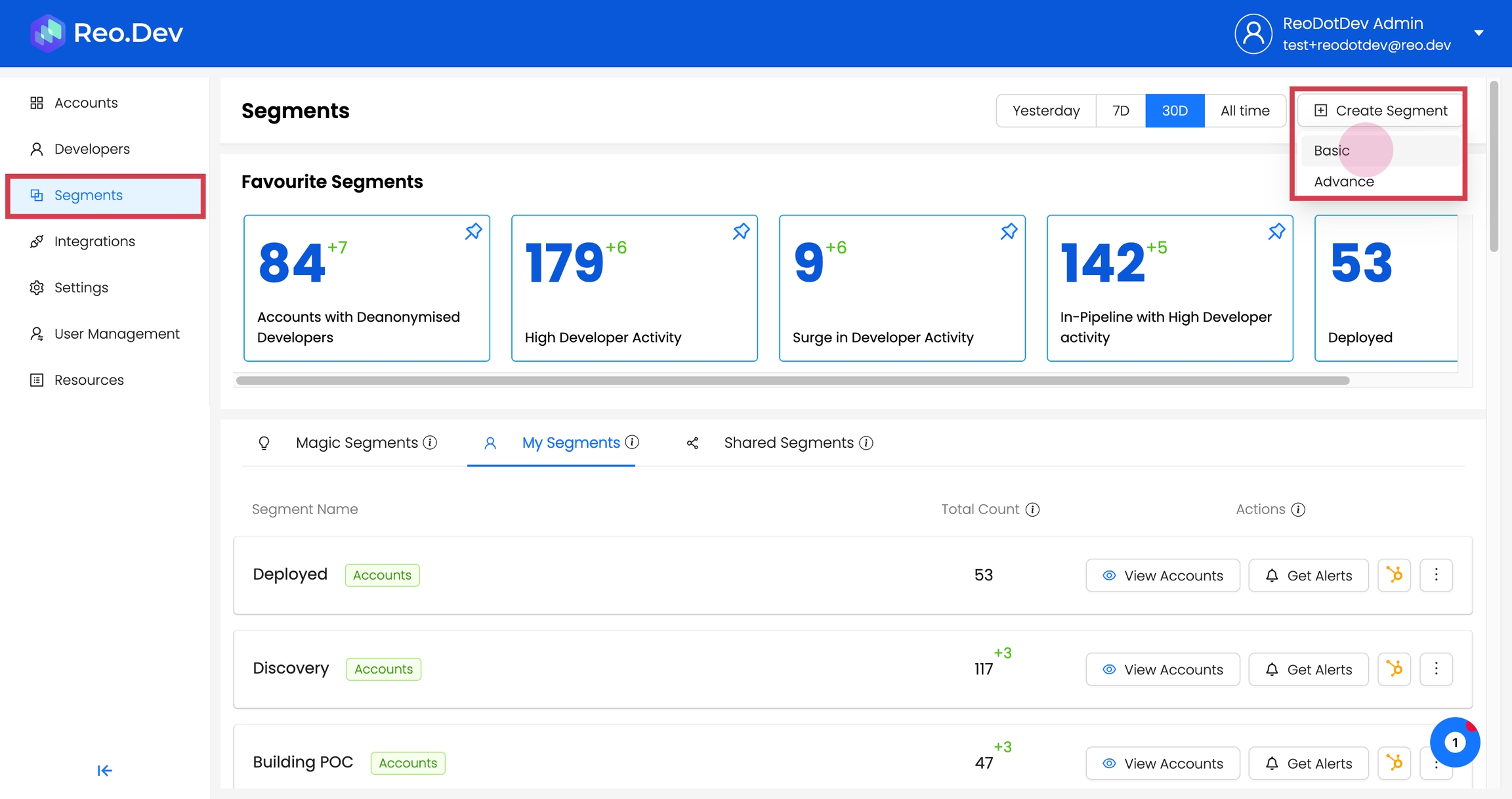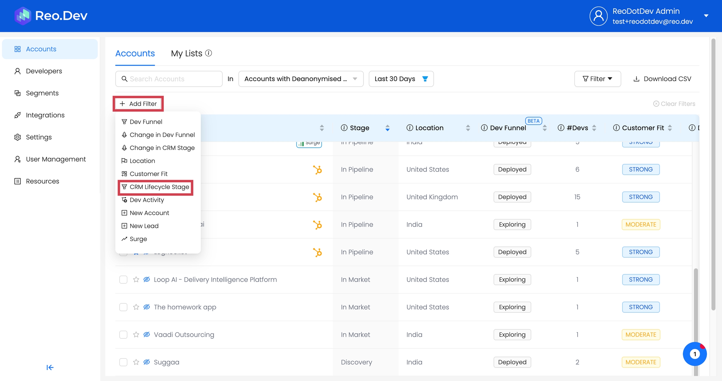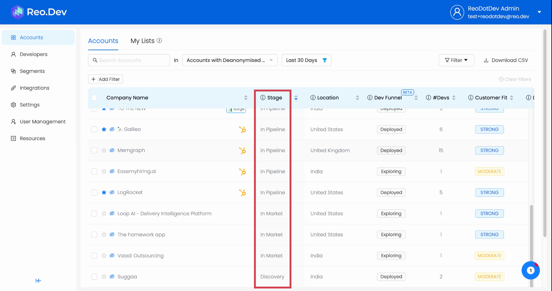 Action: The sales team can conduct targeted outreach based on activities seen in Reo dot dev to push these accounts down the funnel.