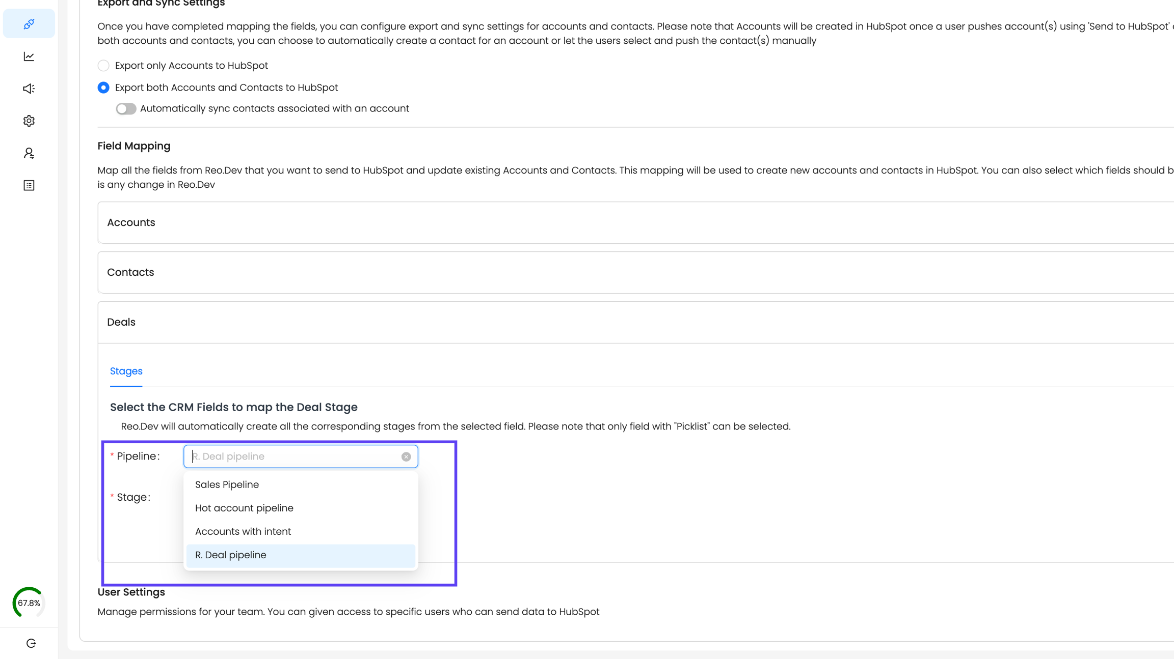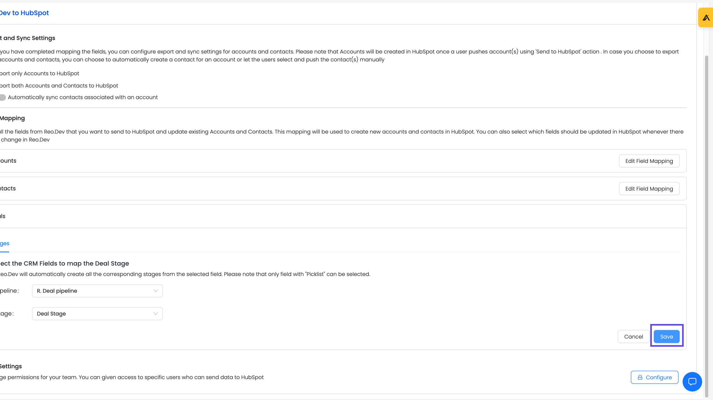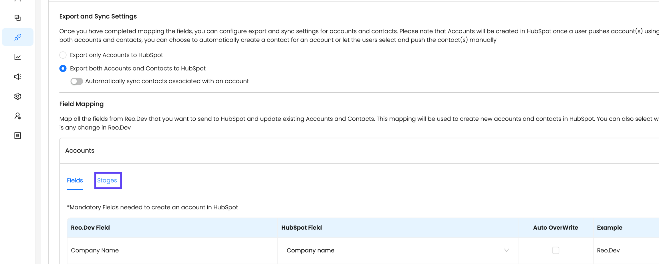 b) For Salesforce: You can directly choose the Stage field to map as Opportunity stages in Reo.Dev.