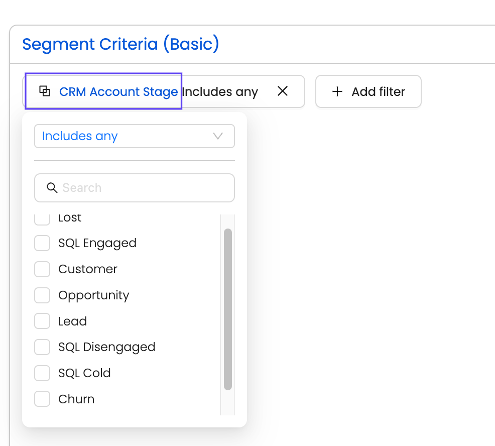 Once mapping is complete and synced, you can leverage the CRM Account Stage and CRM Deal Stage filters to create powerful segments. These filters pull dynamic dropdown options directly from your CRM.
