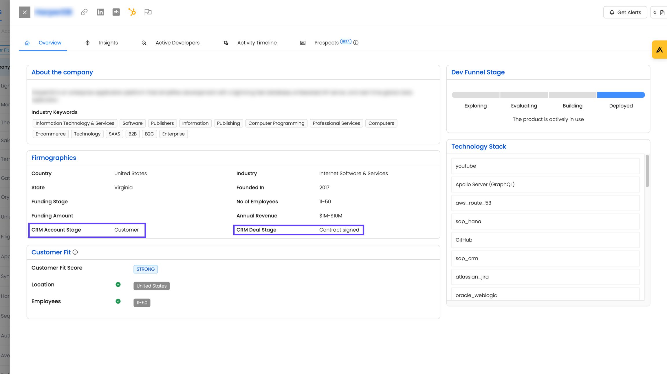 After mapping, visit any account in Reo.Dev. Under the Firmographics section, you'll see the mapped CRM Account Stage and CRM Deal Stage, offering actionable insights at a glance.