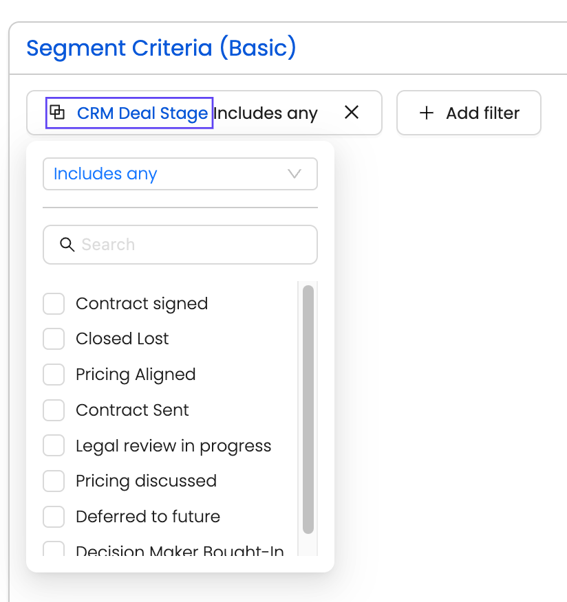 Add criteria to refine your segment. Dropdown options mirror your CRM’s custom stages.