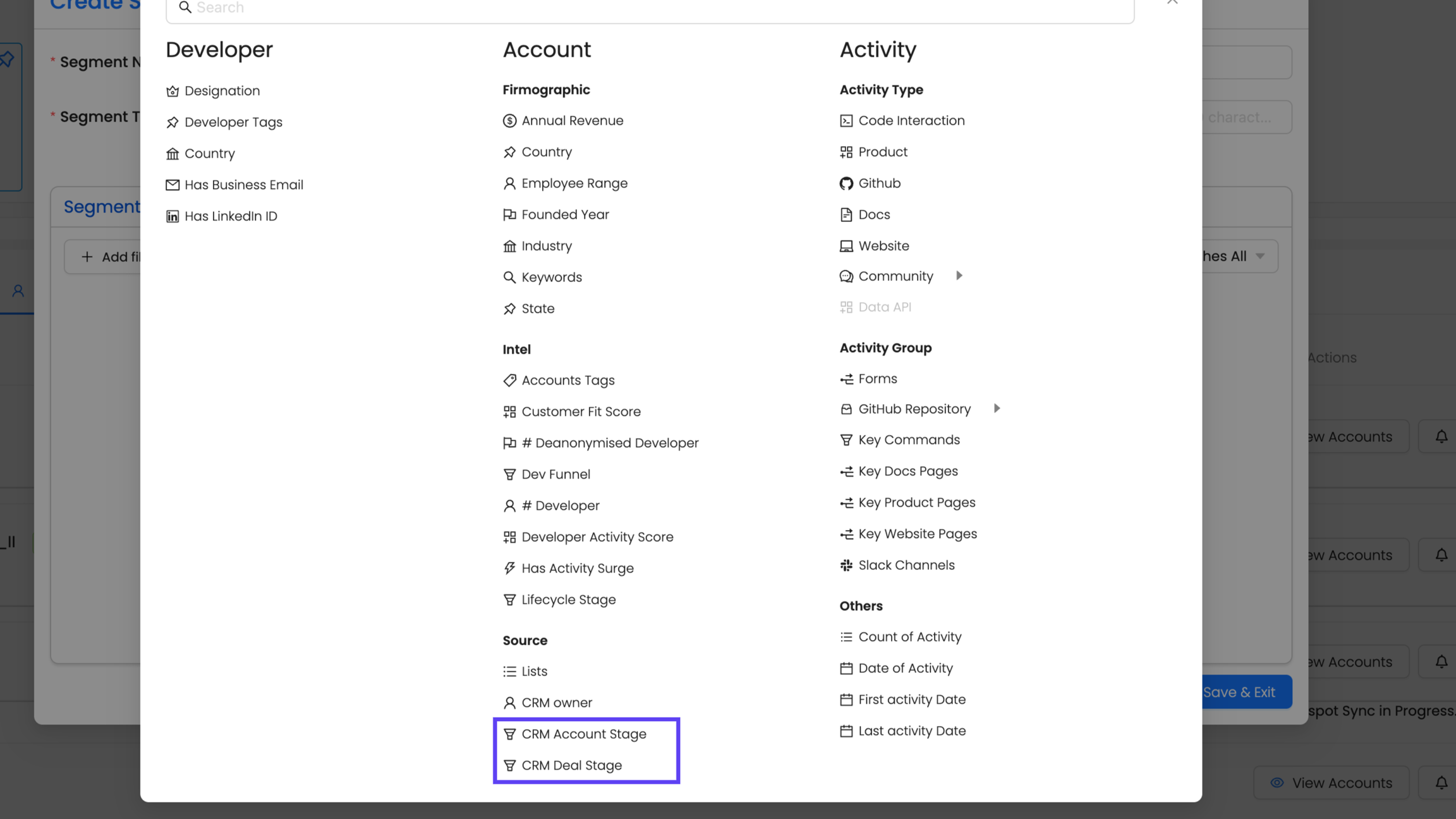 Here is where you can le the CRM Account Stage, CRM Deal Stage, and the powerful Developer Activity Surge filter, you now have a way to surface those high-intent accounts exactly when they’re showing renewed interest.