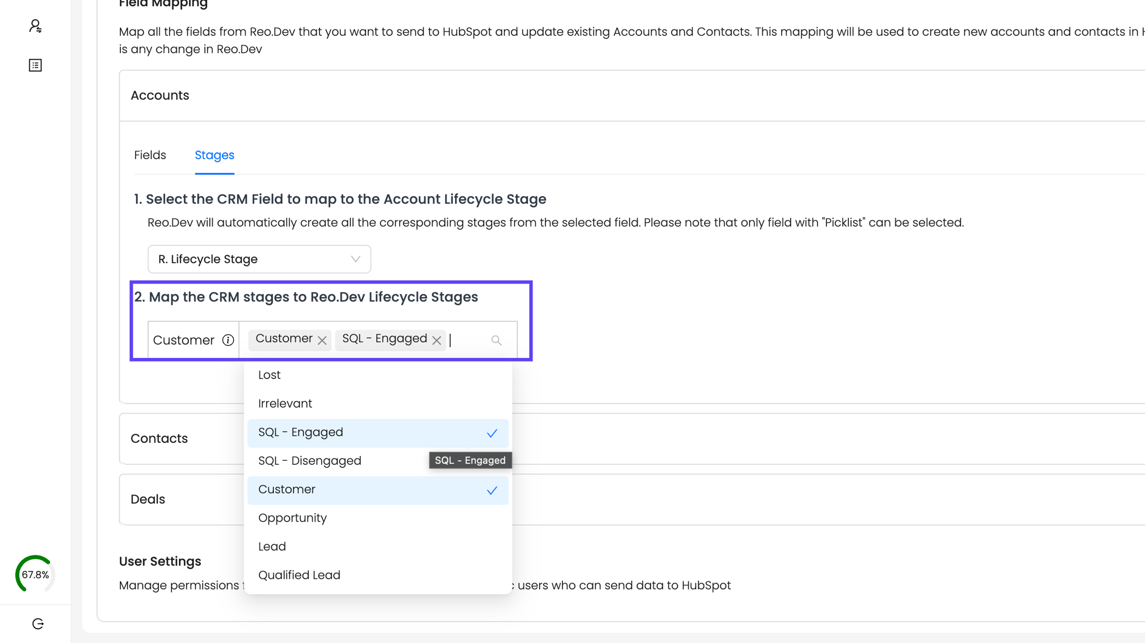 The Custom CRM Stages feature now addresses this by allowing the mapping of your custom picklist fields from HubSpot or Salesforce to Reo.Dev’s lifecycle stages. This ensures accurate filtering and segmentation that are aligned with your CRM setup.