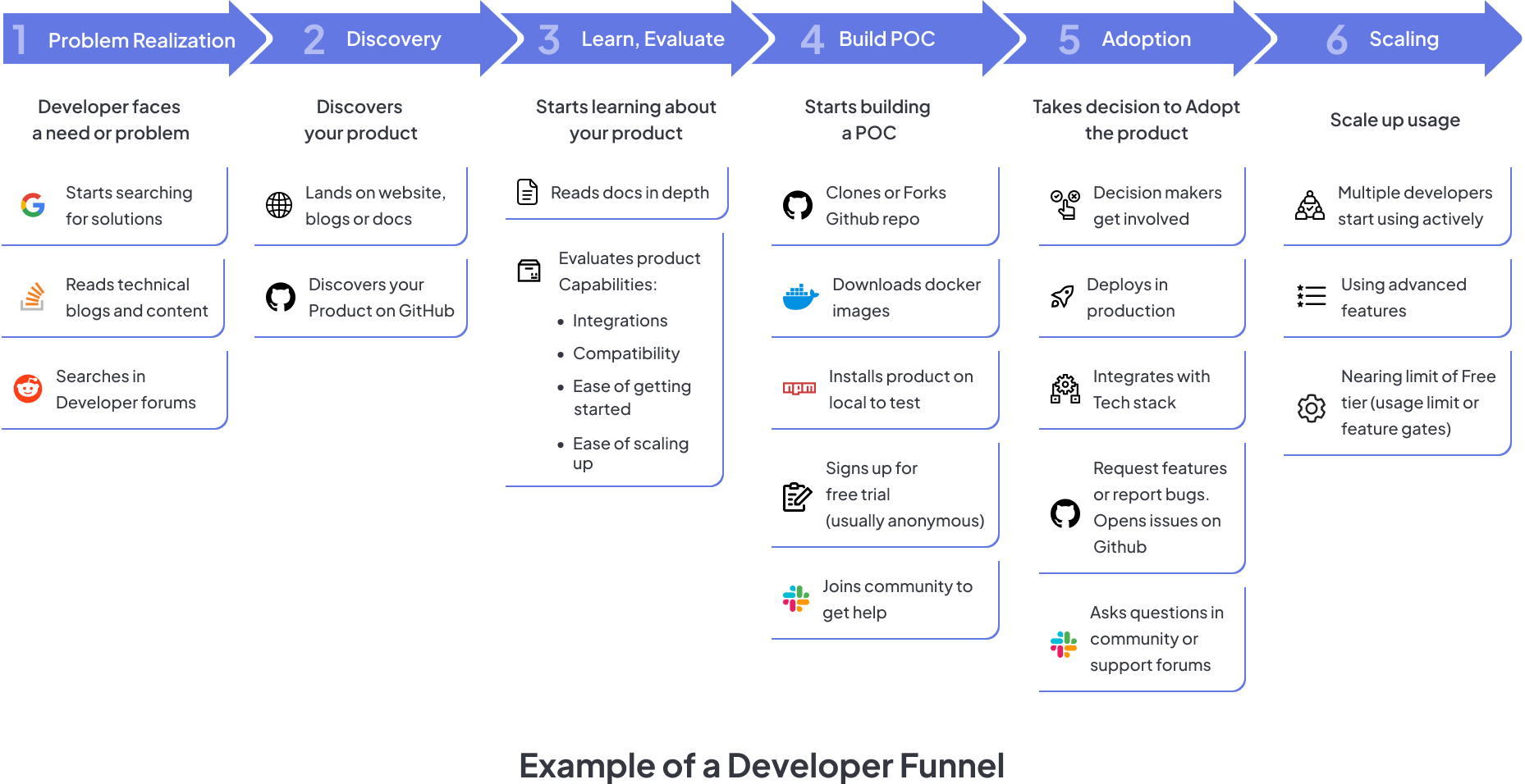 Building developer community: DevRels can identify and engage with developers in the Exploring and Evaluation phases, fostering a community that supports detailed product exploration.