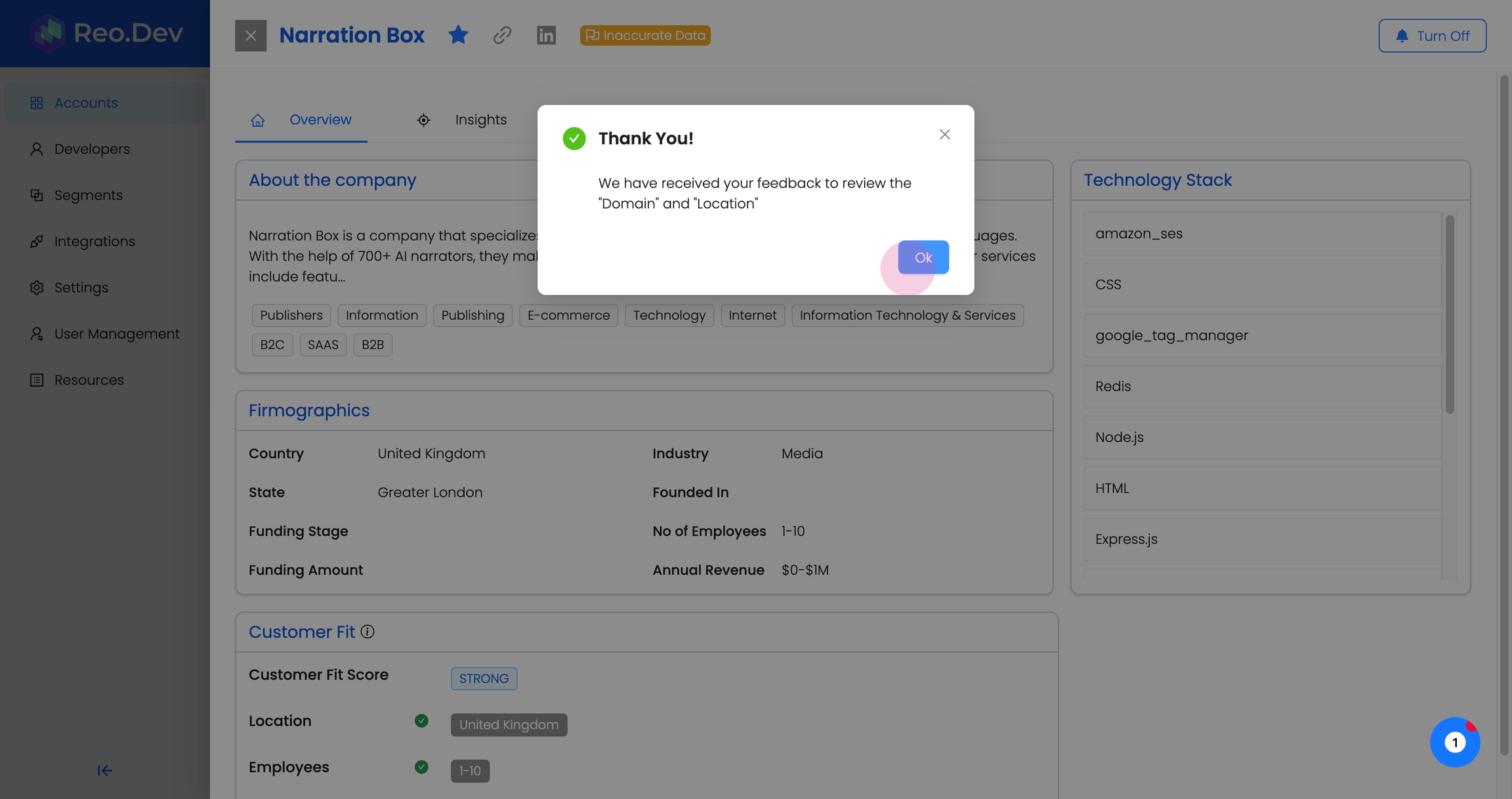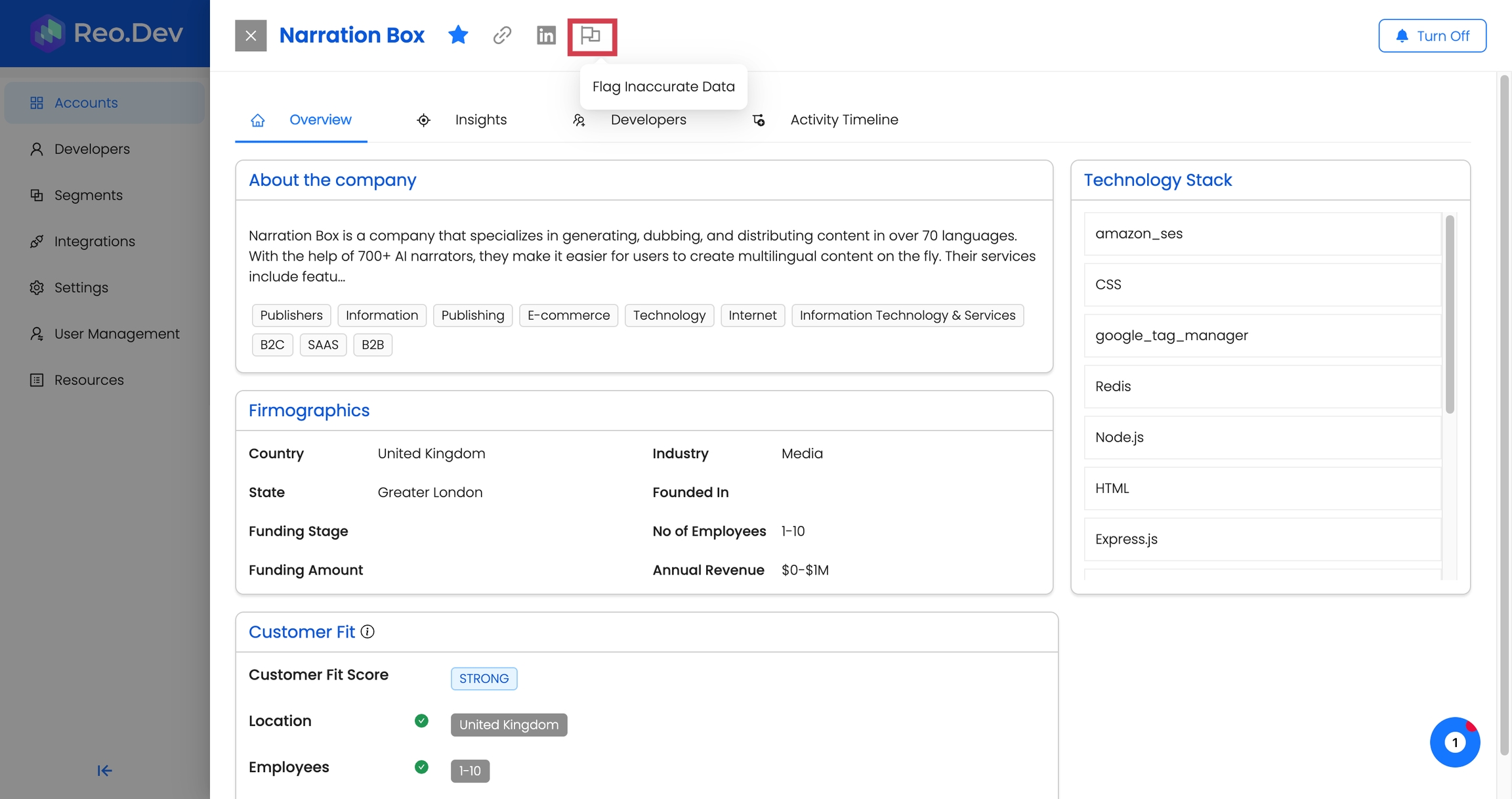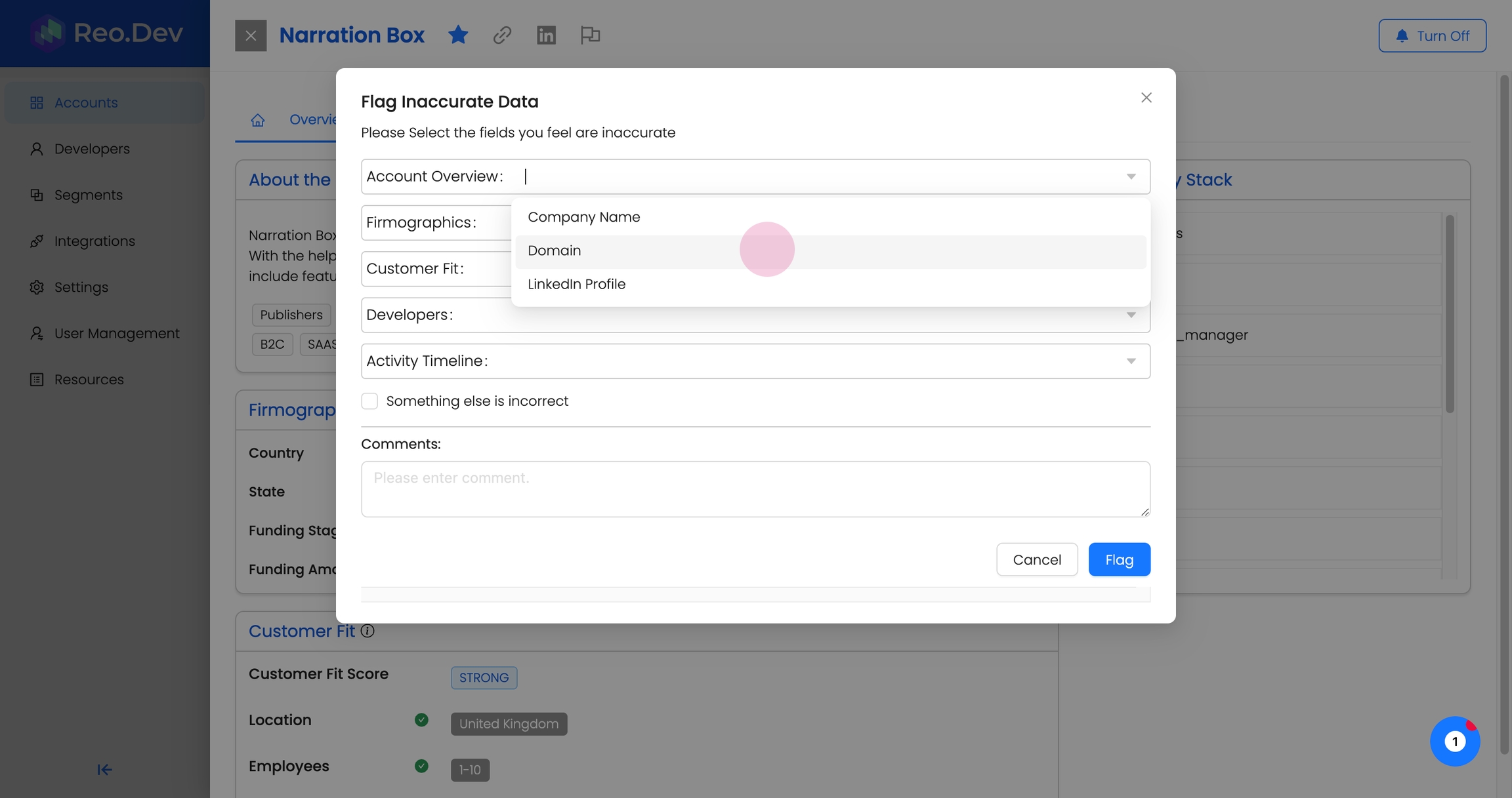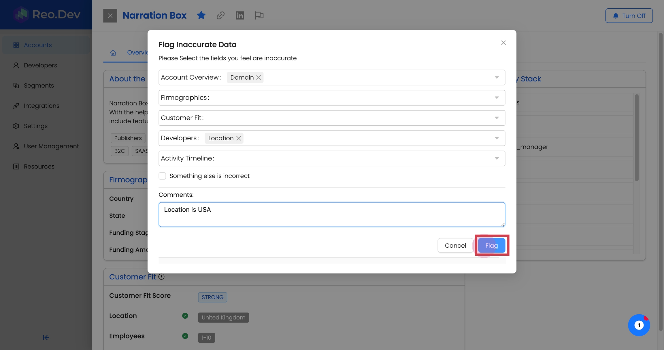 To ensure the data provided in Reo.Dev is up-to-date and reliable, improving the quality of account intelligence, users can flag incorrect data at the account level.