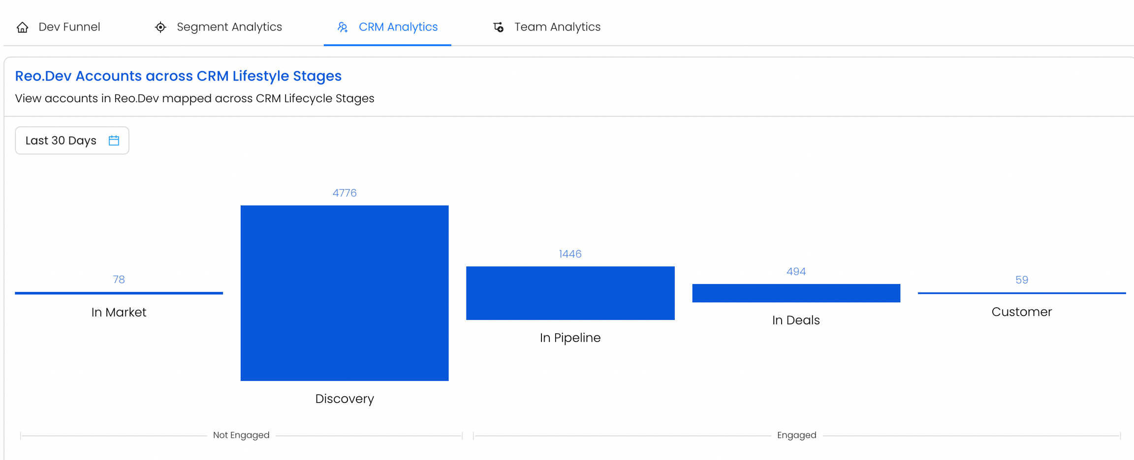 Reo.Dev Accounts across CRM Lifestyle Stages: Here you can view accounts in Reo.Dev mapped across CRM Lifecycle Stages: