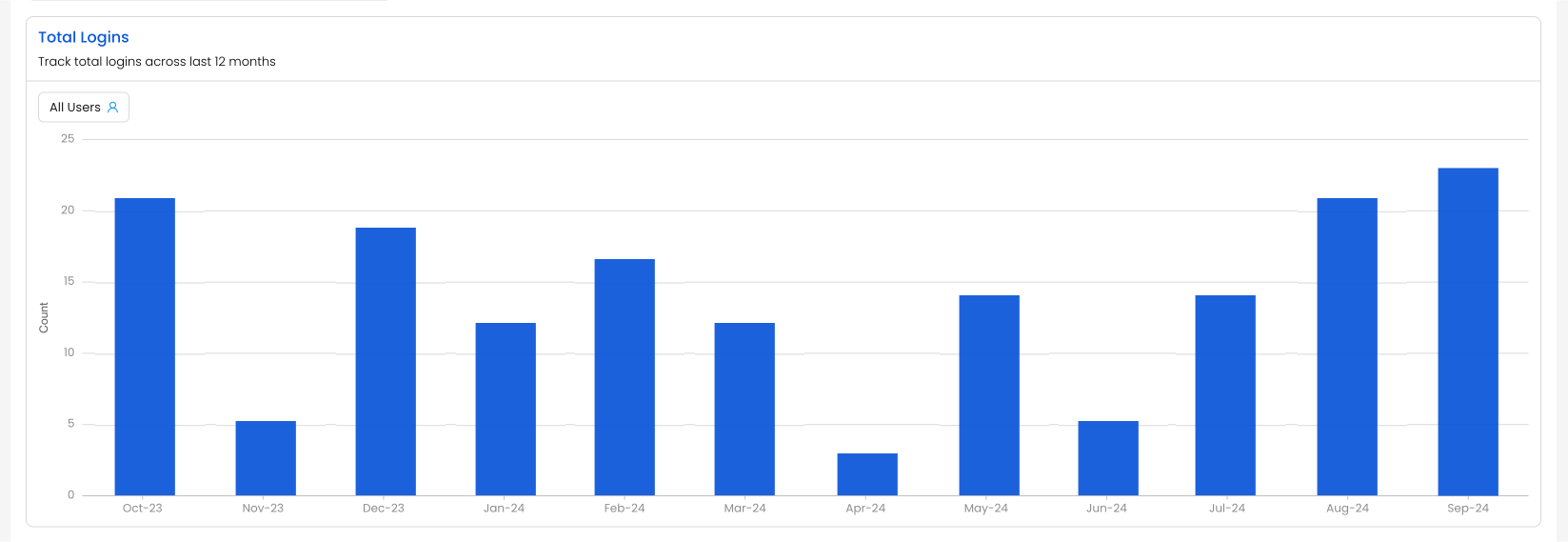 2. Total Logins: This section displays the total logins over the past 12 months, either for individual users or all users combined.