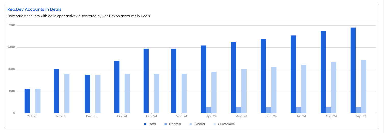 Reo.Dev accounts in Deals: In this section, you can compare accounts with developer activity discovered by Reo.Dev vs accounts in Deals. Metrics tracked:
