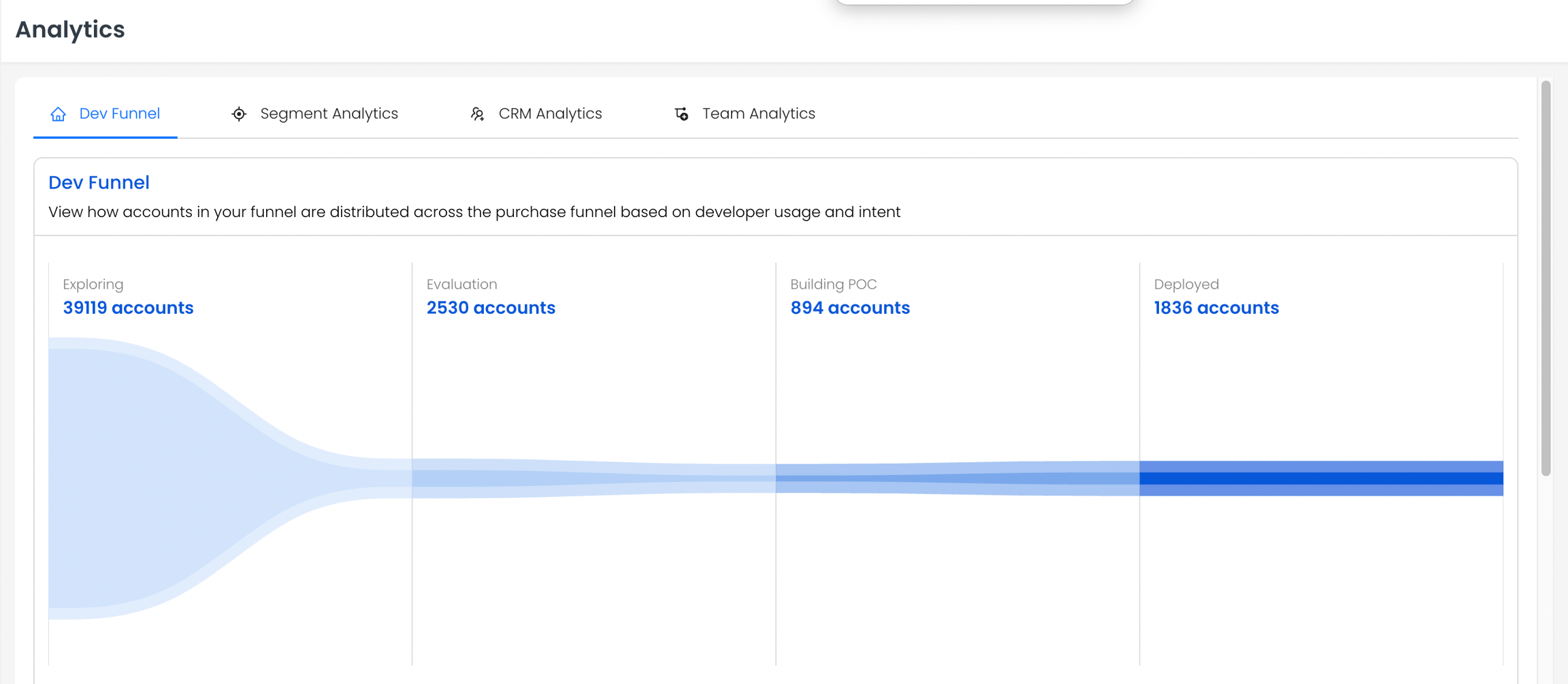 Dev Funnel: The developer funnel graph provides an overview of the number of accounts in each stage of the developer buying journey.