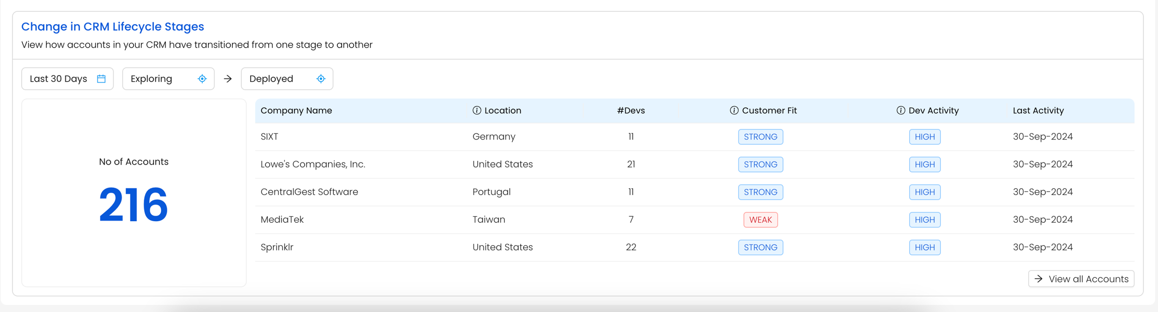 2. Change in Dev Funnel: This graph gives an insight into how accounts have moved across the Dev funnel in a given timeframe. e.g You can get the list of accounts that have transitioned from Exploring Stage to Building POC in the Last 30 Days.