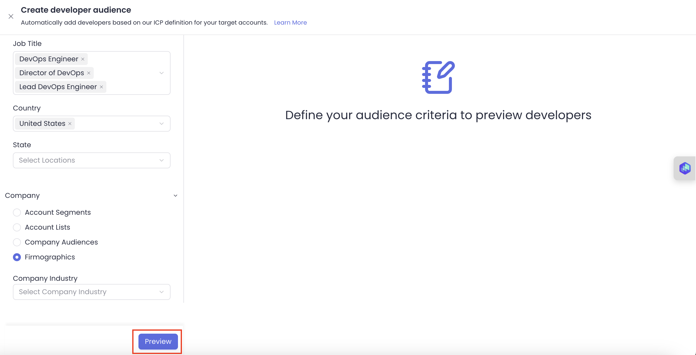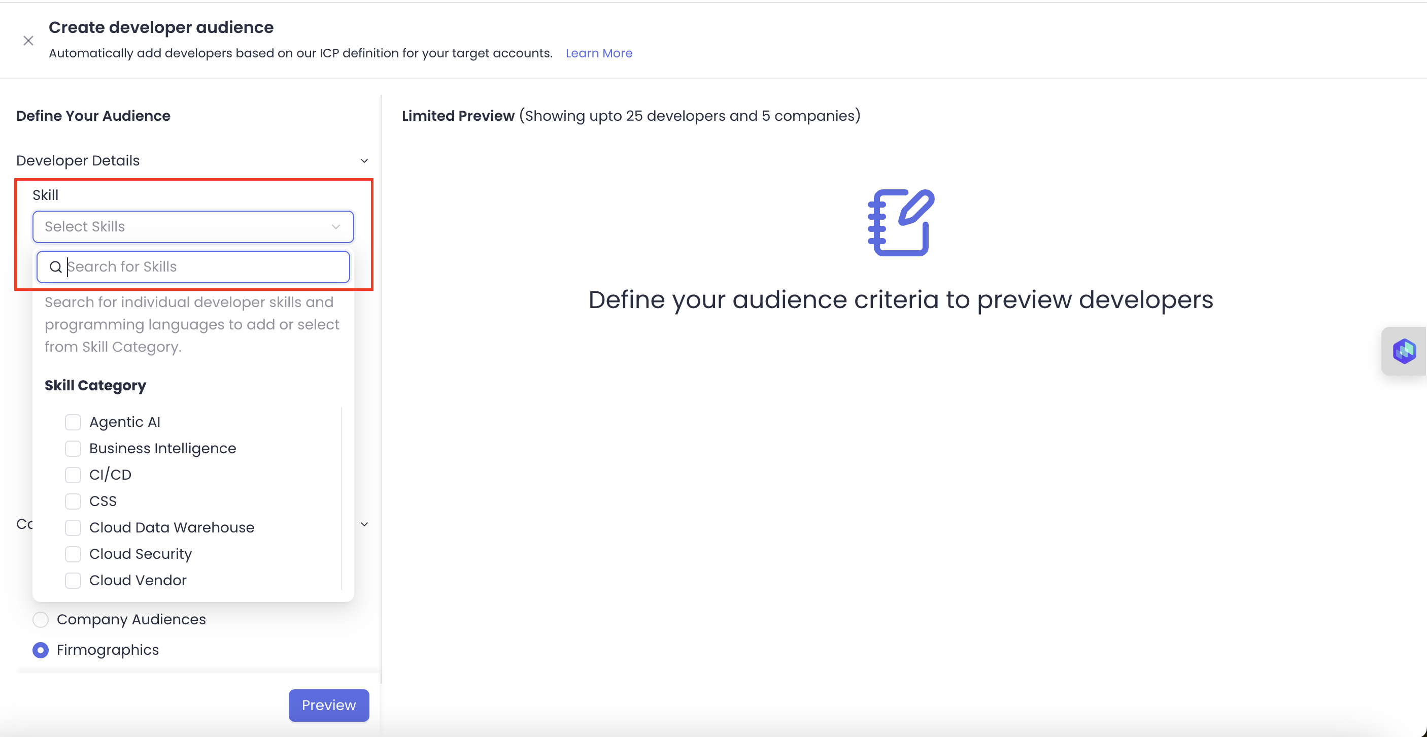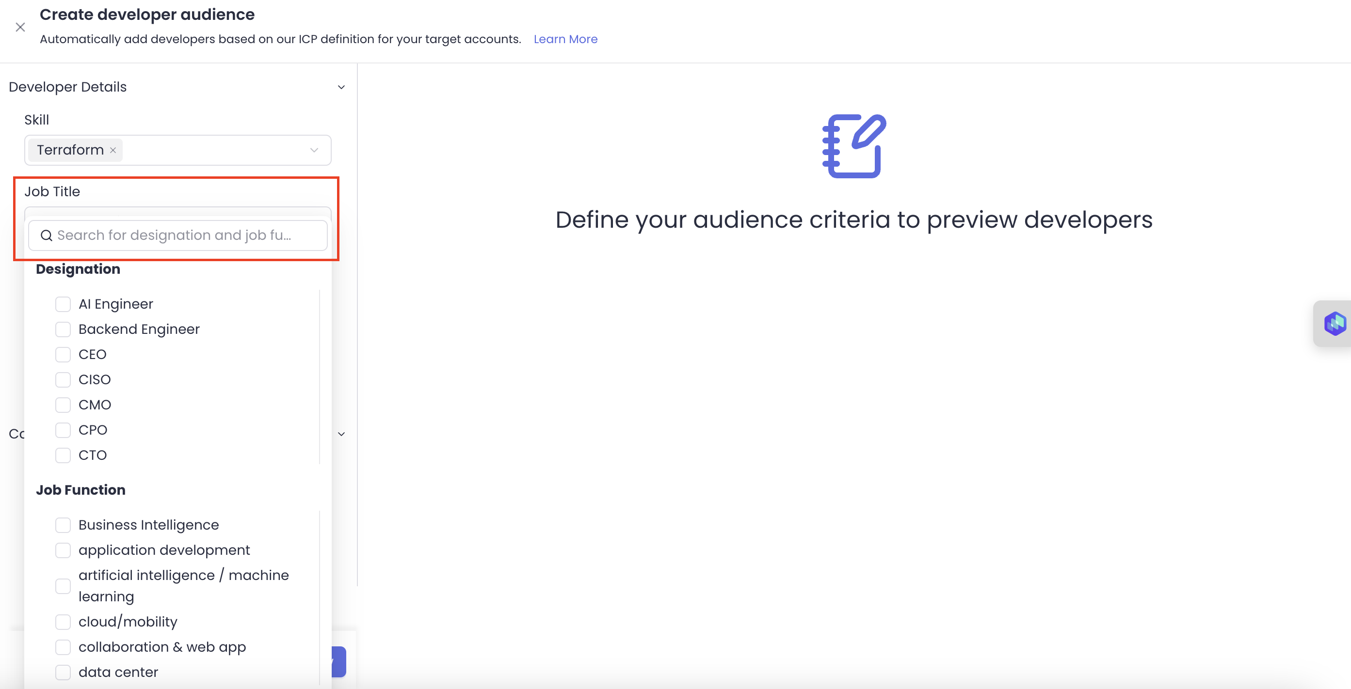 This section explains how you can leverage the developer audience feature to find developers based on specific skillsets, job title, and location within your target account lists or company audience.