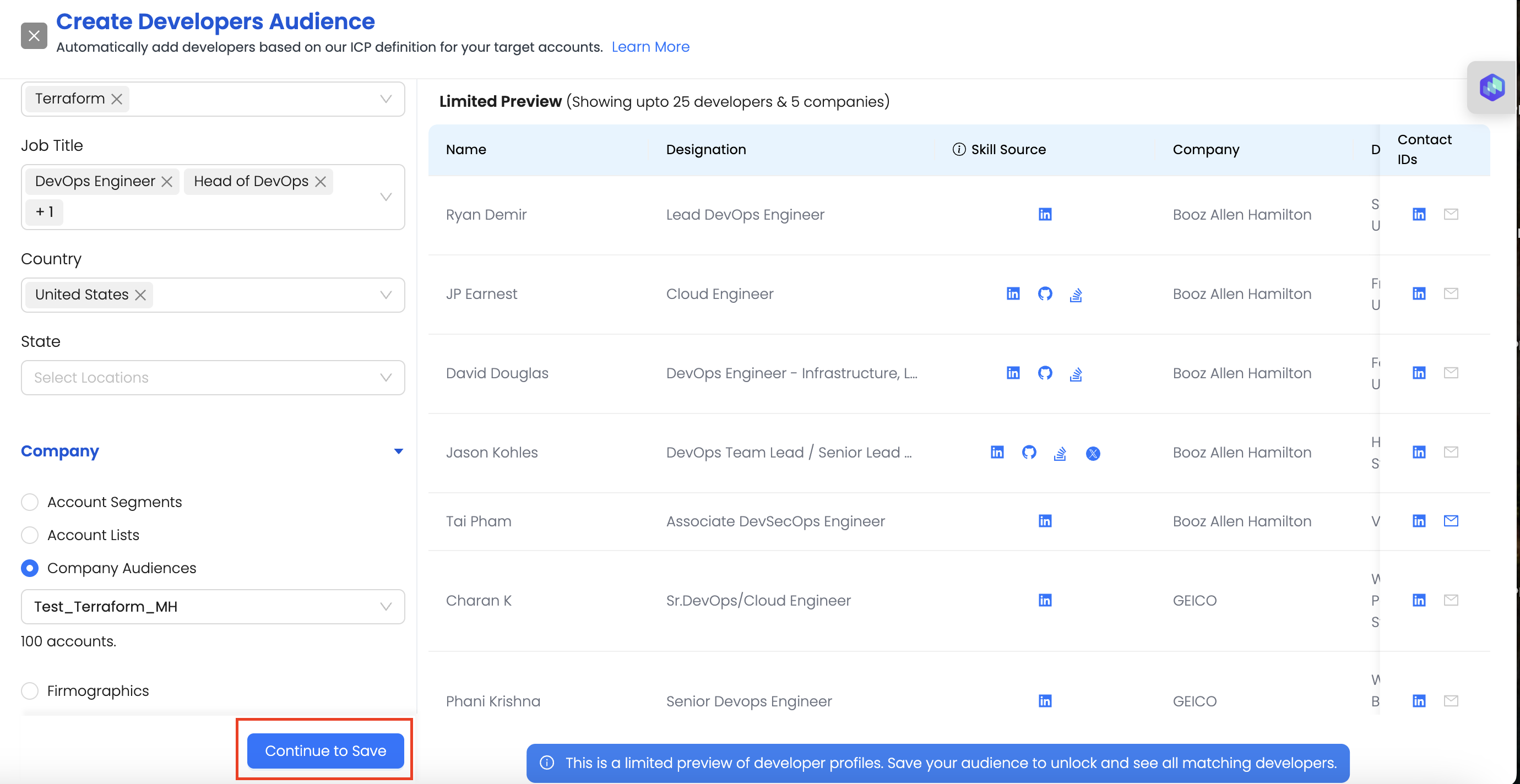 3. **Company Audiences** - You can further find developer from accounts within a company audience.