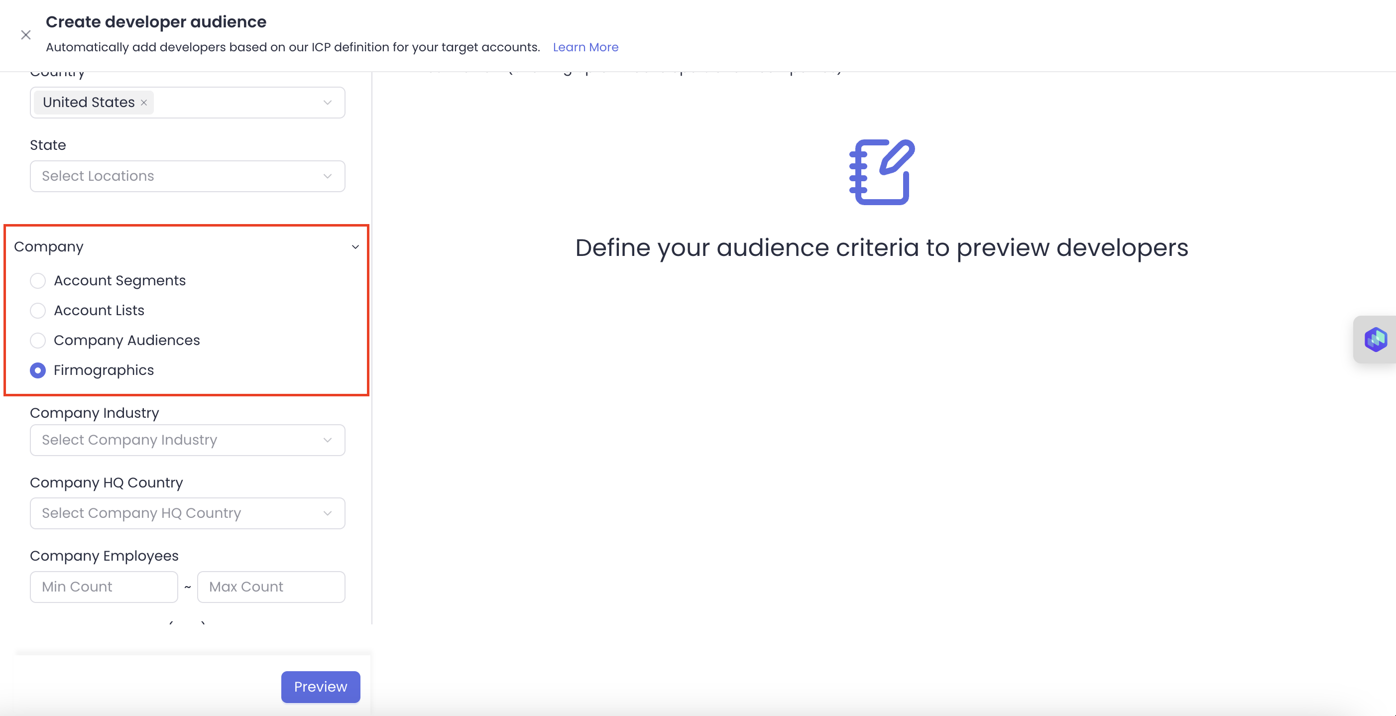 4. **Firmographics** - You can also choose to just find developers from companies based on specific firmographic filters (company industry, company HQ Country, revenue, employees)