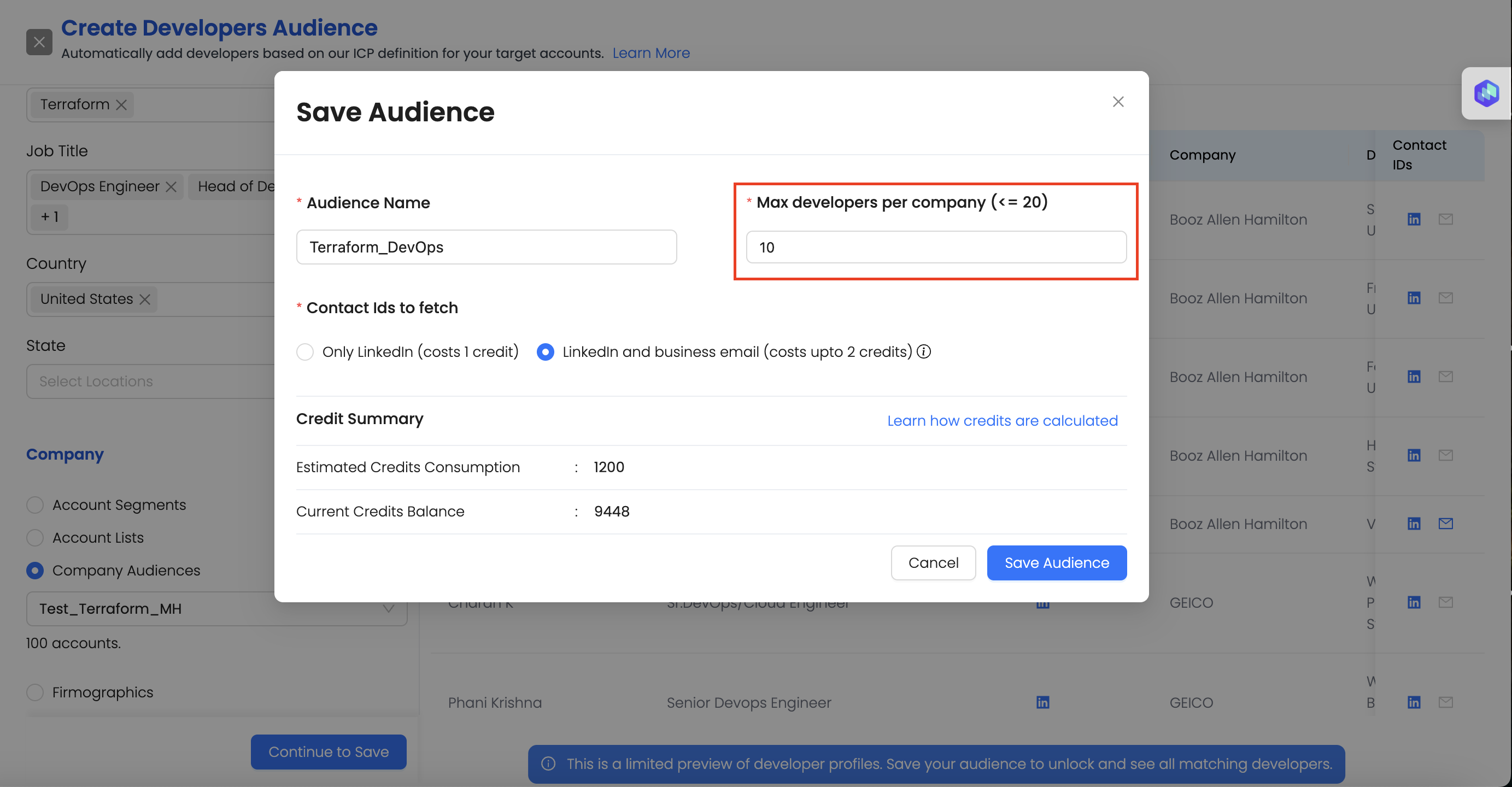 **Step 8:** Define **max developers per company**: Here you can select the maximum number of developers you want to add from each company. You can choose upto 20 developers per company.