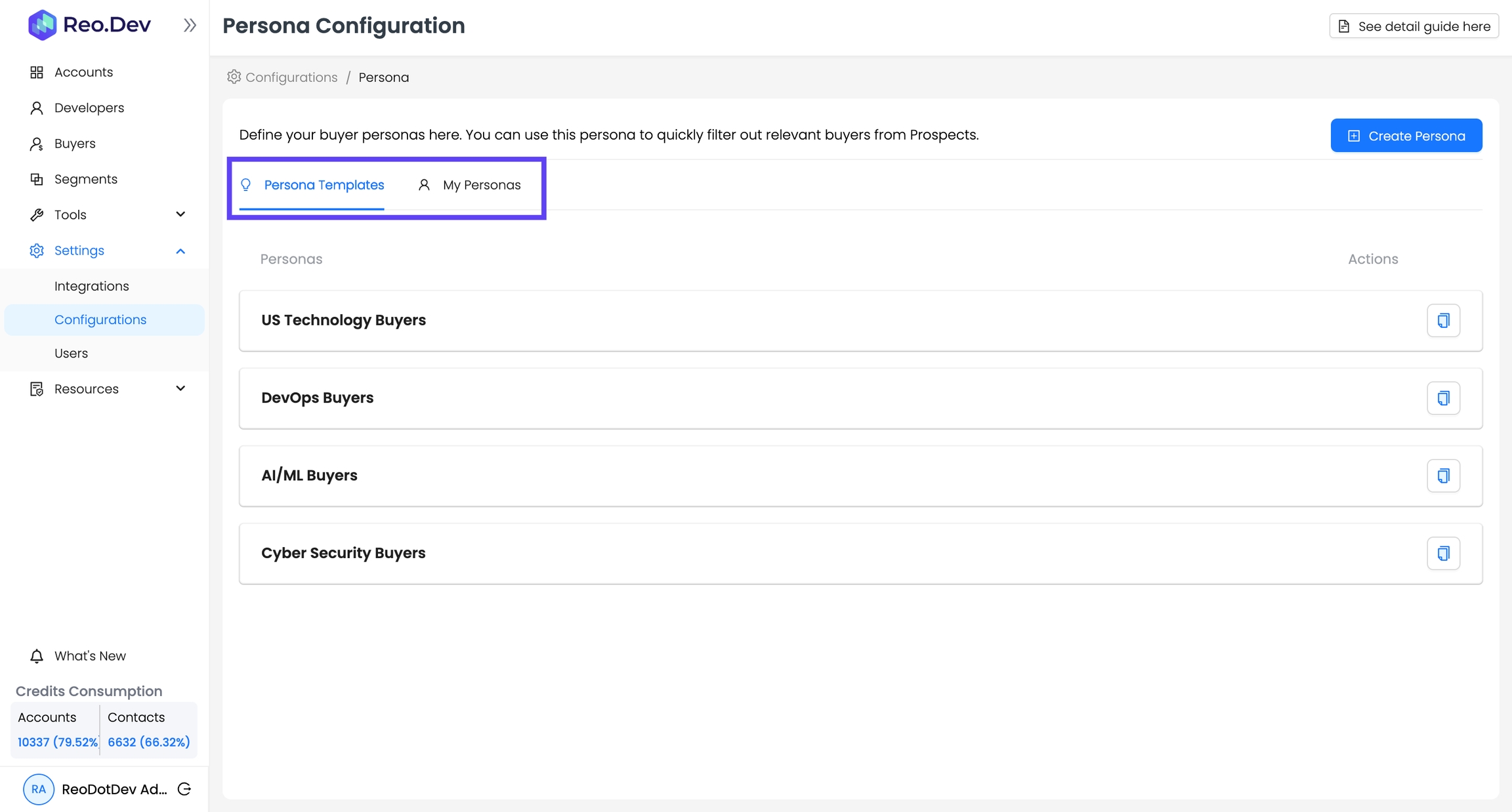 Reo.Dev’s Buyer Persona feature allows you to define custom personas for both buyers (decision-makers) and developers (practitioners) to refine your prospecting strategy.