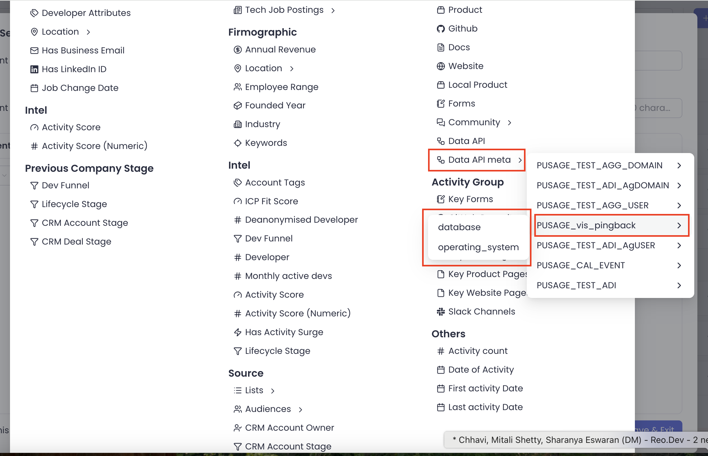 * In the Segmentation filters, the available meta activity types are displayed for filtering under Activity > Activity Type > Data API/Data API Meta
