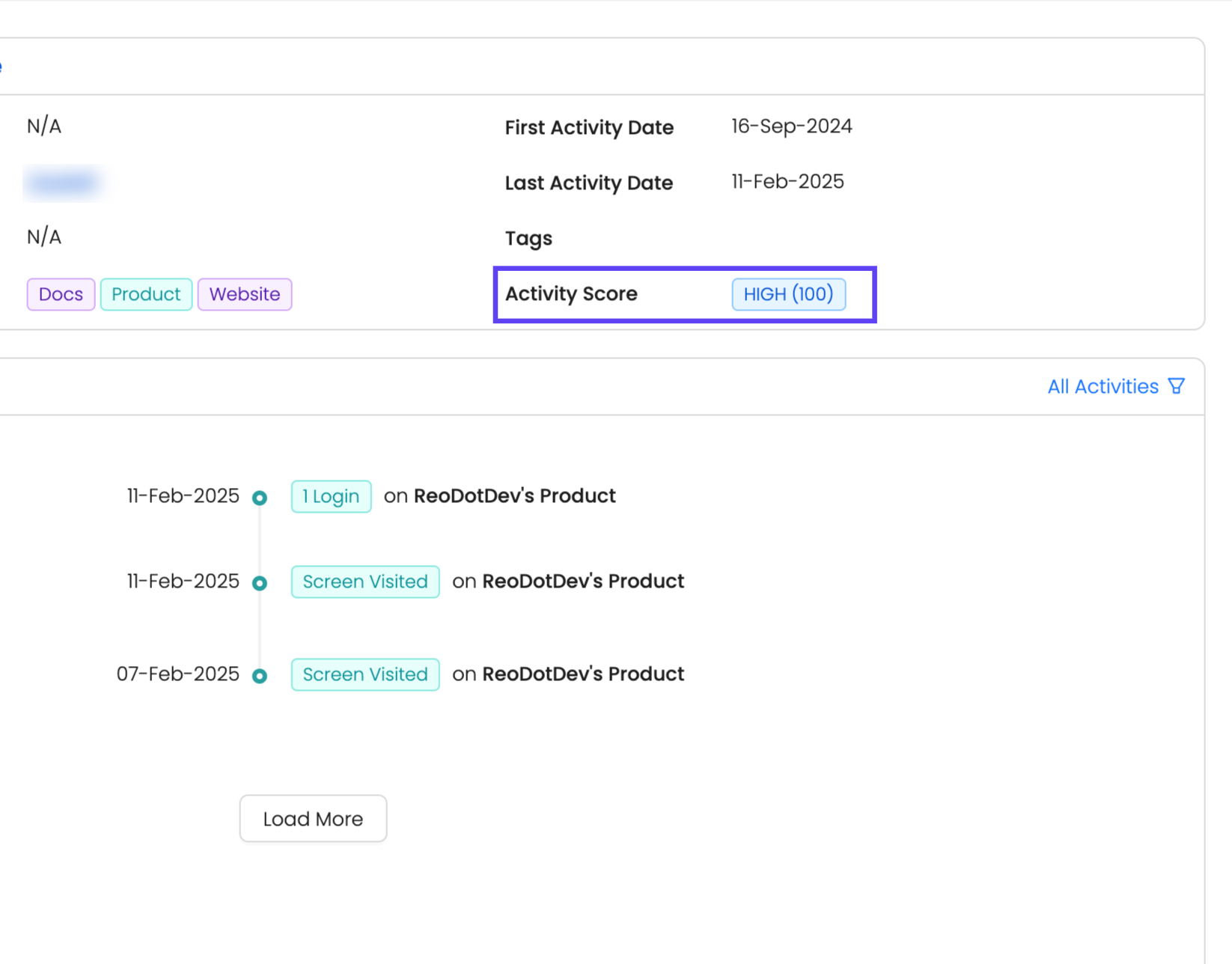 The Activity Score at the developer level in Reo.Dev is a personalized engagement metric that evaluates an individual developer’s interactions with your product ecosystem. It provides a numerical (0-100) and categorical (High, Medium, Low) score based on their recency, frequency, and intent of activities.