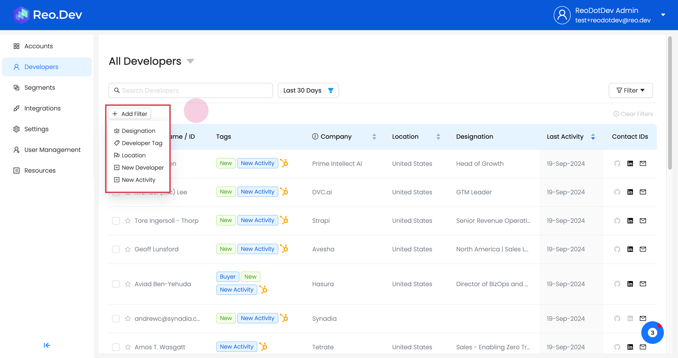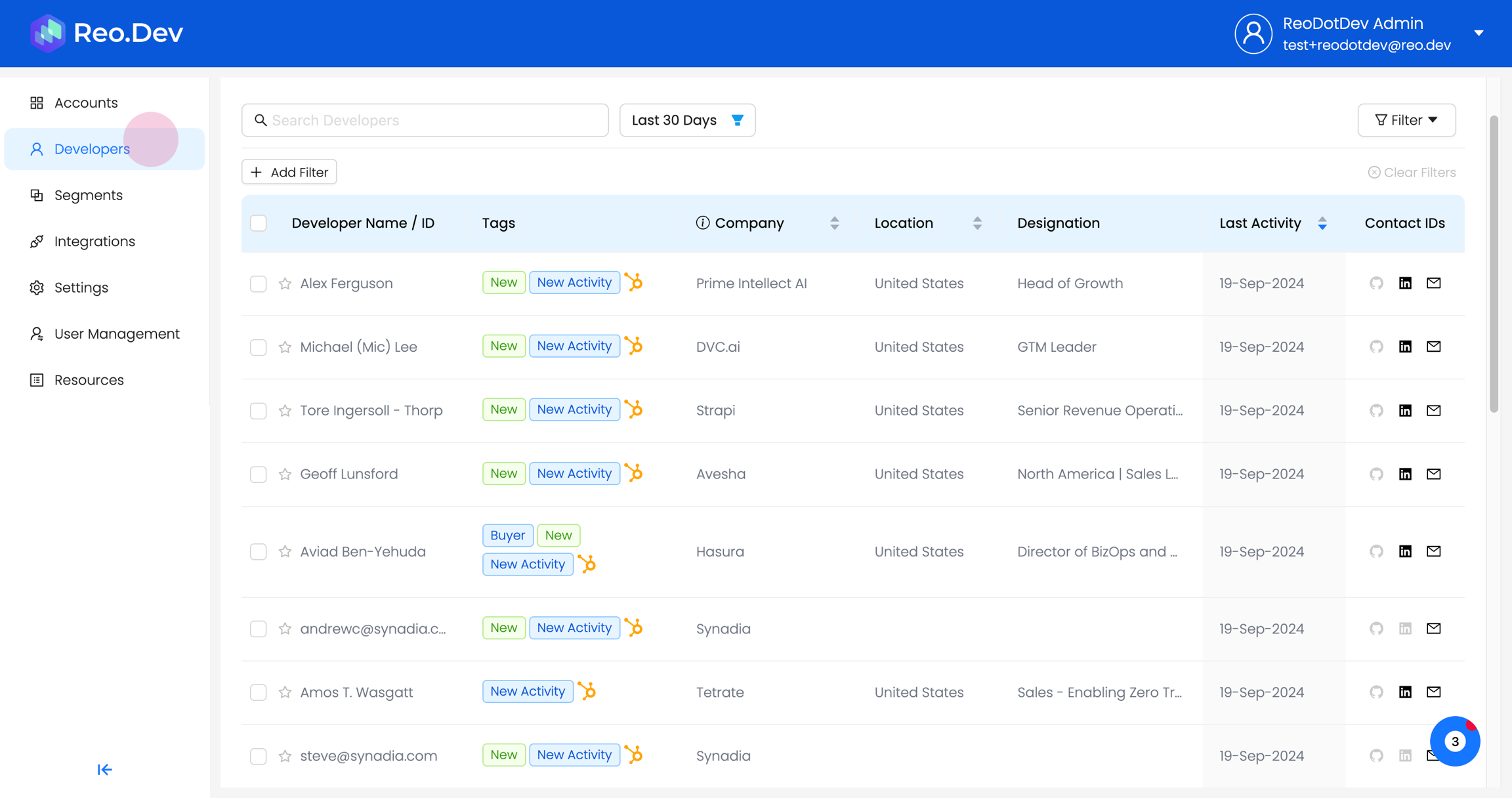 Reo.Dev empowers GTM teams with in-depth insights into the developers interacting with your assets. By navigating to the Developers tab in the Reo.Dev, you gain access to valuable intel on deanonymized developers. This article will walk you through the various elements of the intel provided for each developer.