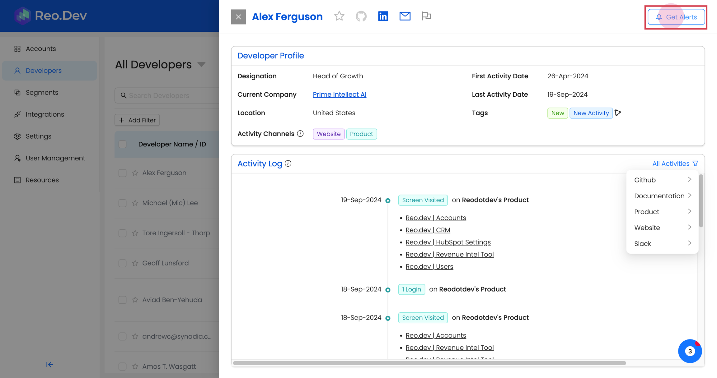 Click on Get Alerts to receive Slack notifications whenever the developer performs an activity.