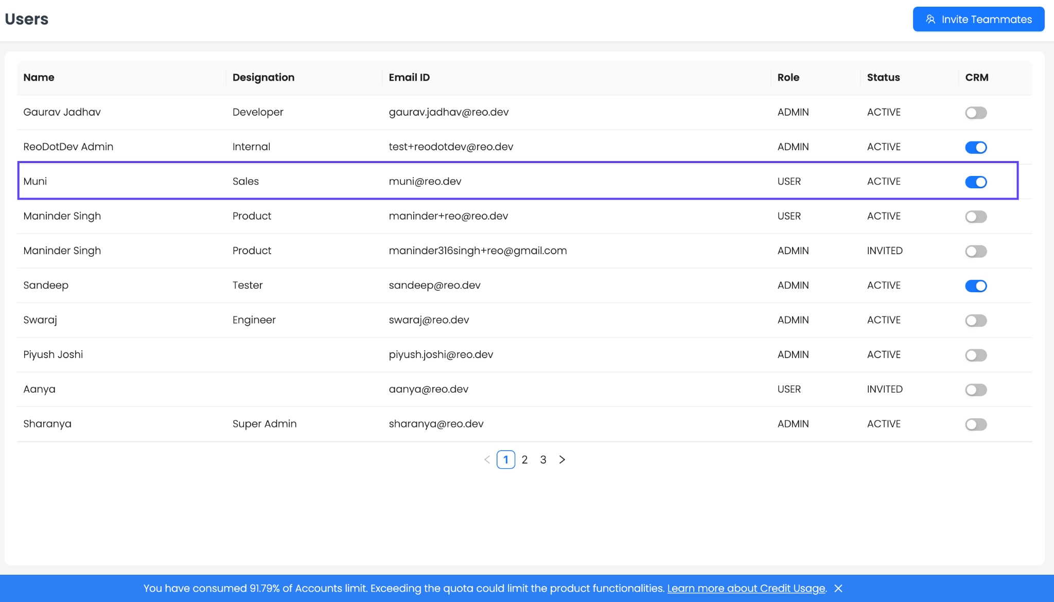 6. Toggle CRM permissions "On" for the required user.