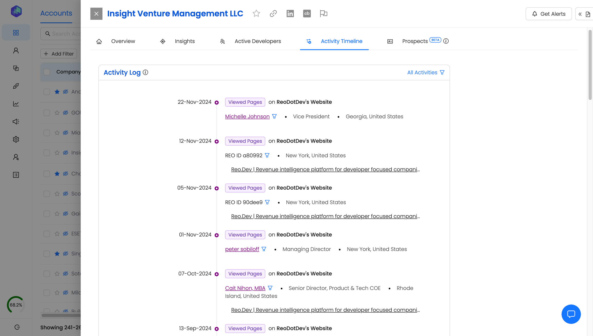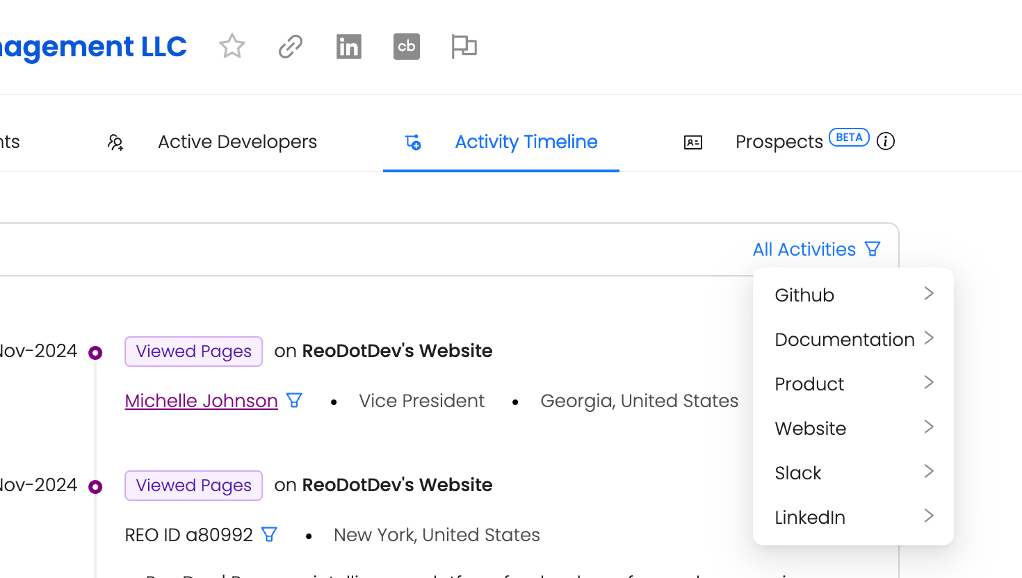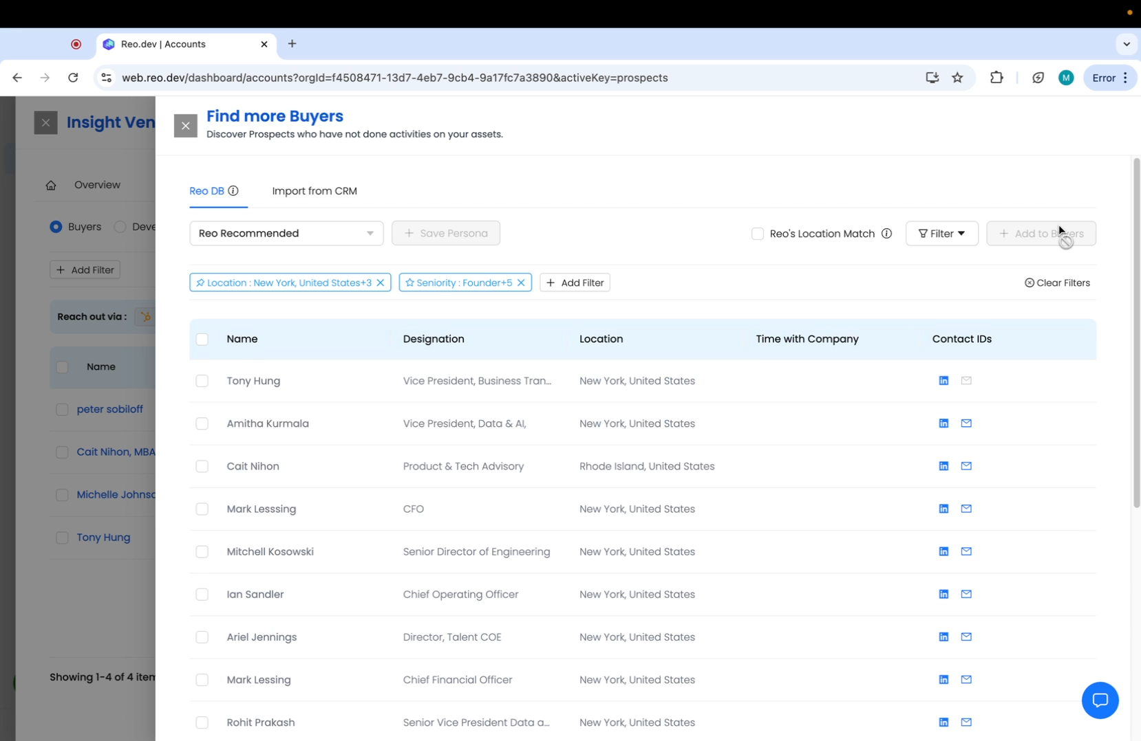 By default, you will find a list of all Reo recommended buyers based on developer activity by location and seniority level.