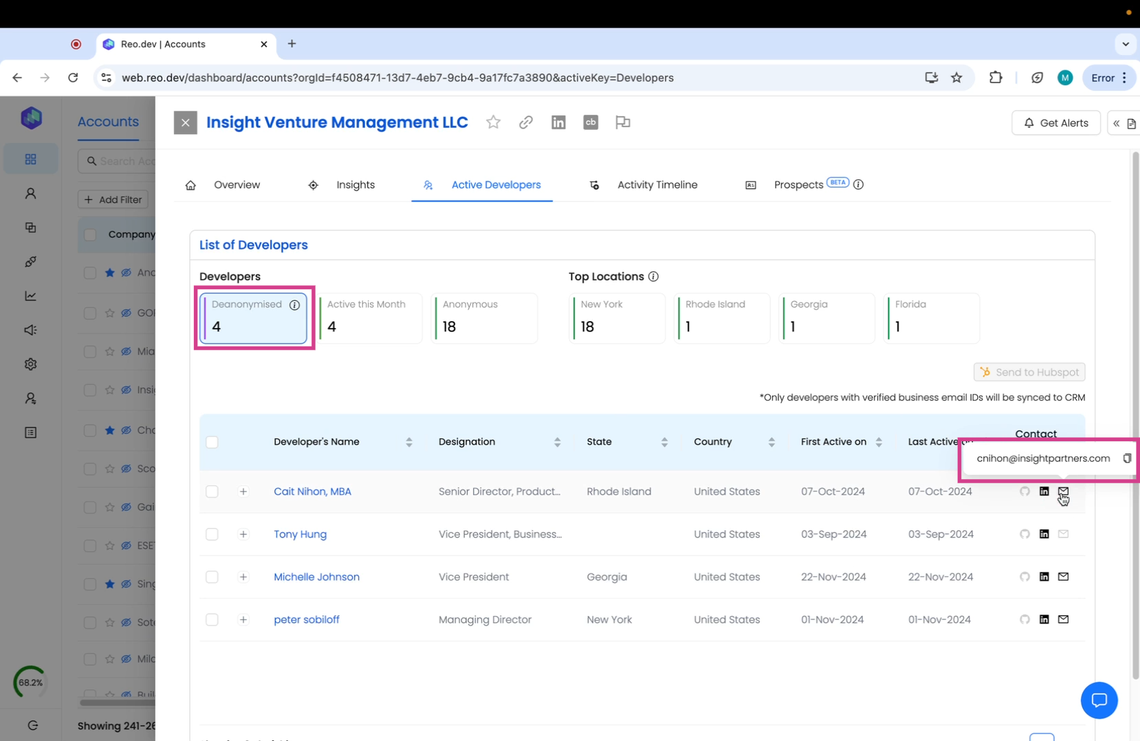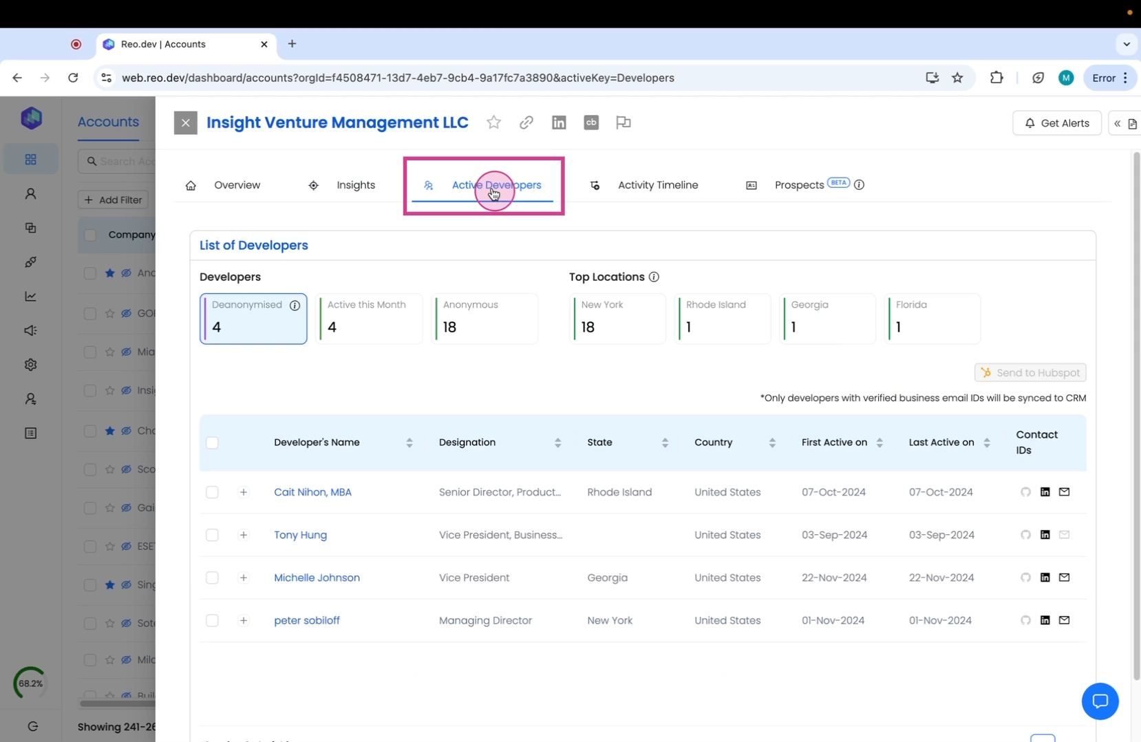 Here, you're also able to view all the de-anonymized developers and get access to contact information such as their business email IDs.