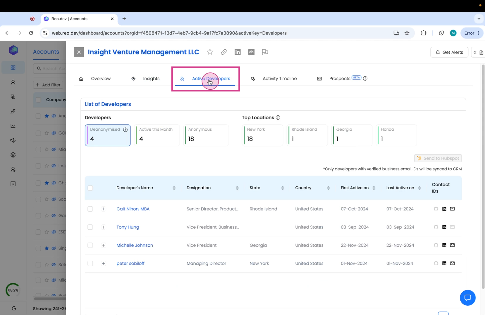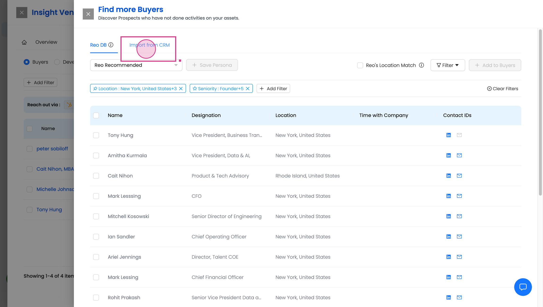Lastly, if your CRM is integrated with Reo.Dev, you will also be able to see the prospects already present in your CRM .