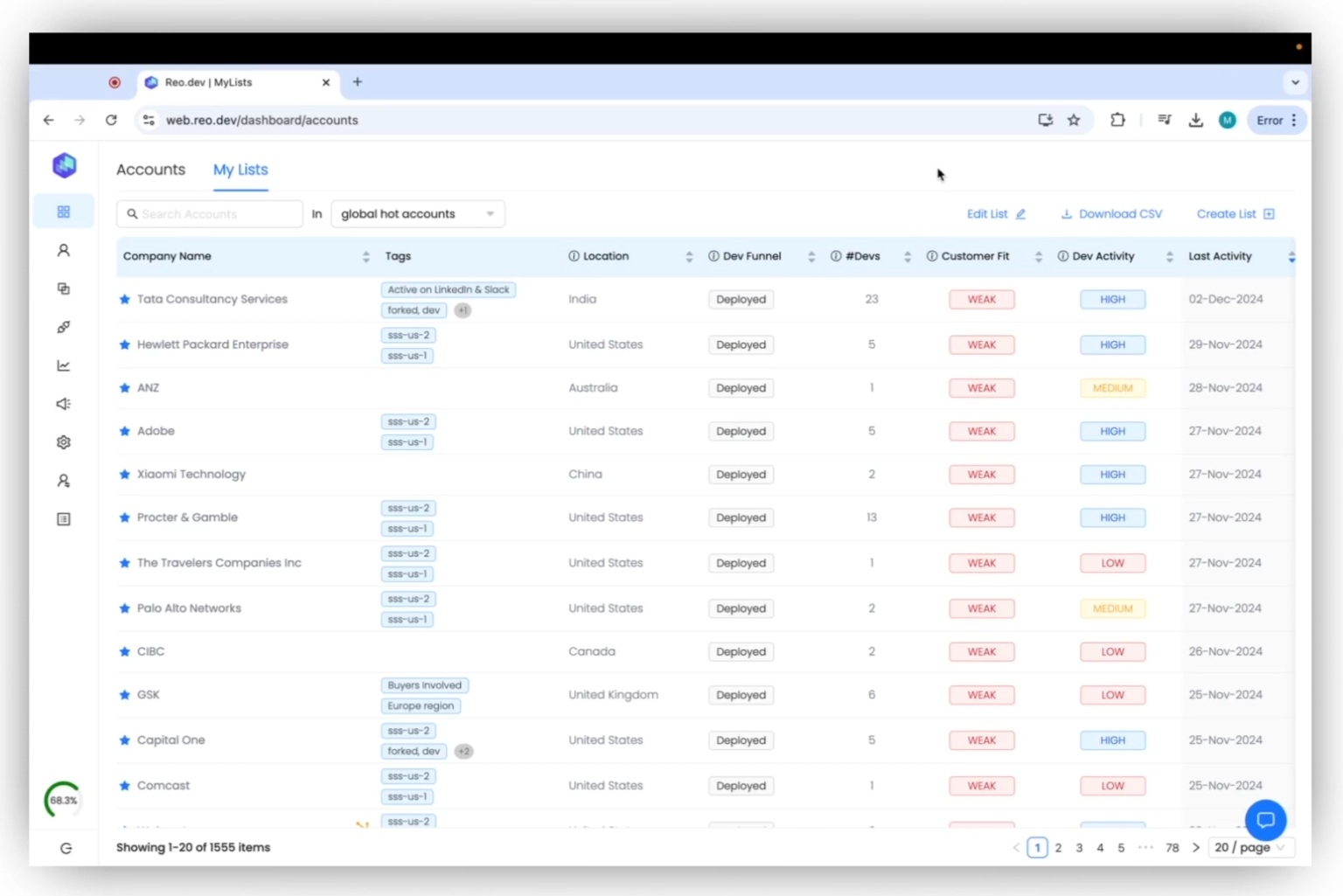 In a few minutes, Reo.Dev will automatically enrich the data on your accounts with detailed developer insights.