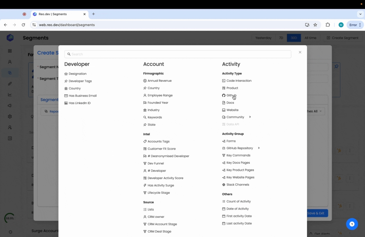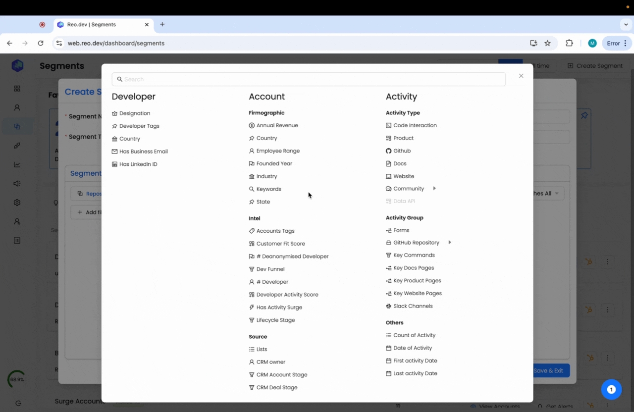 Segments in Reo dev are cohorts of accounts and developers categorized based on specific attributes. In this article, we will guide you on creating segments to find high-intent accounts.