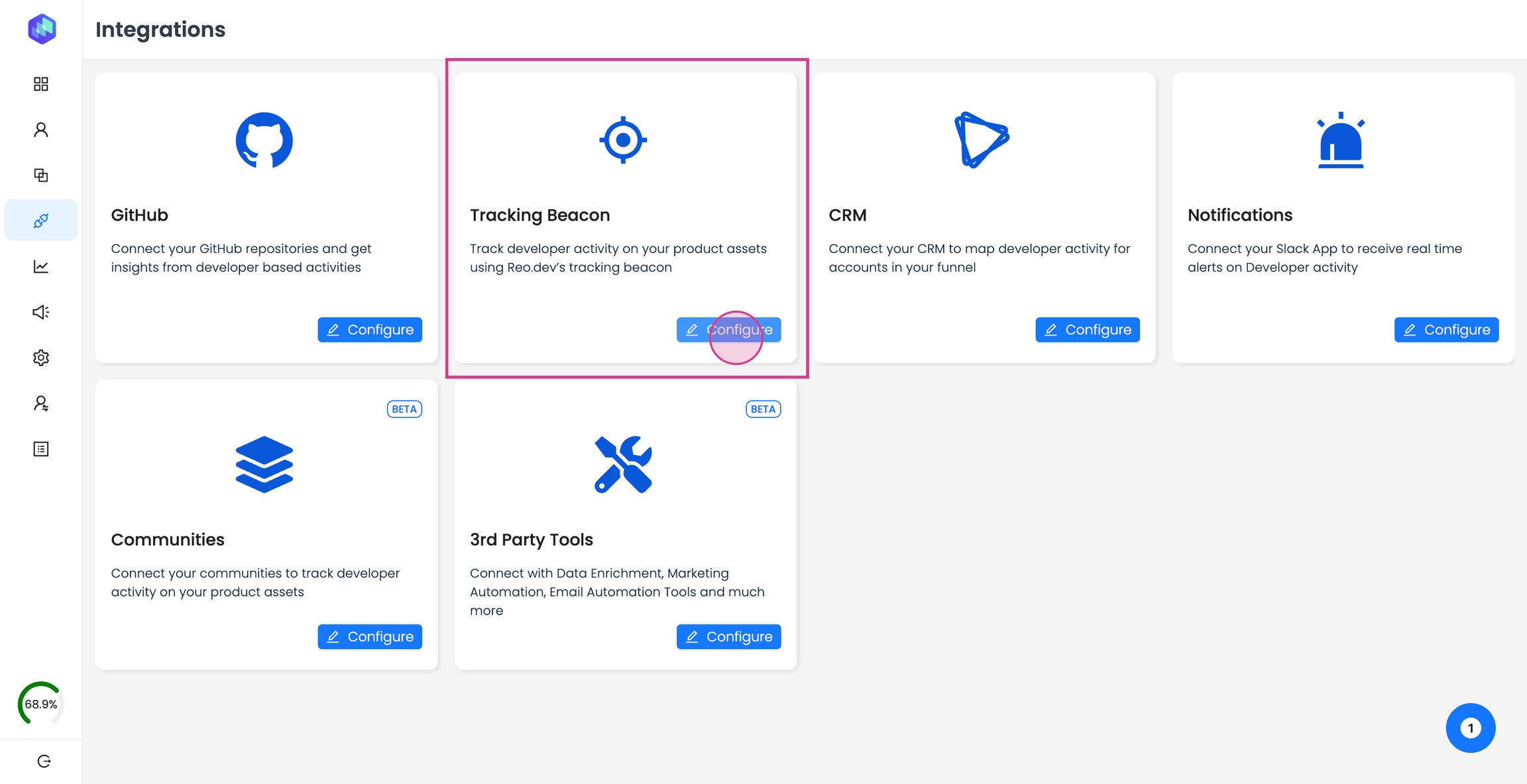 Step 1: On the integrations page, click on configure in the 'tracking beacon' card.