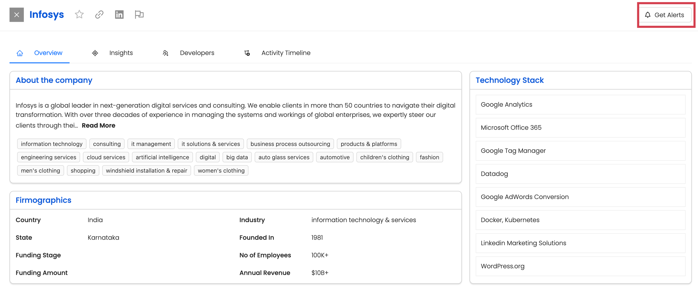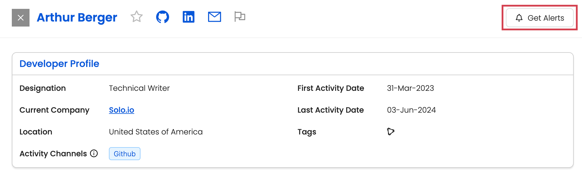 Developers: To set up notifications for a developer, click into a developer name in the list and then click on the Get Alerts icon in the top-right of header section