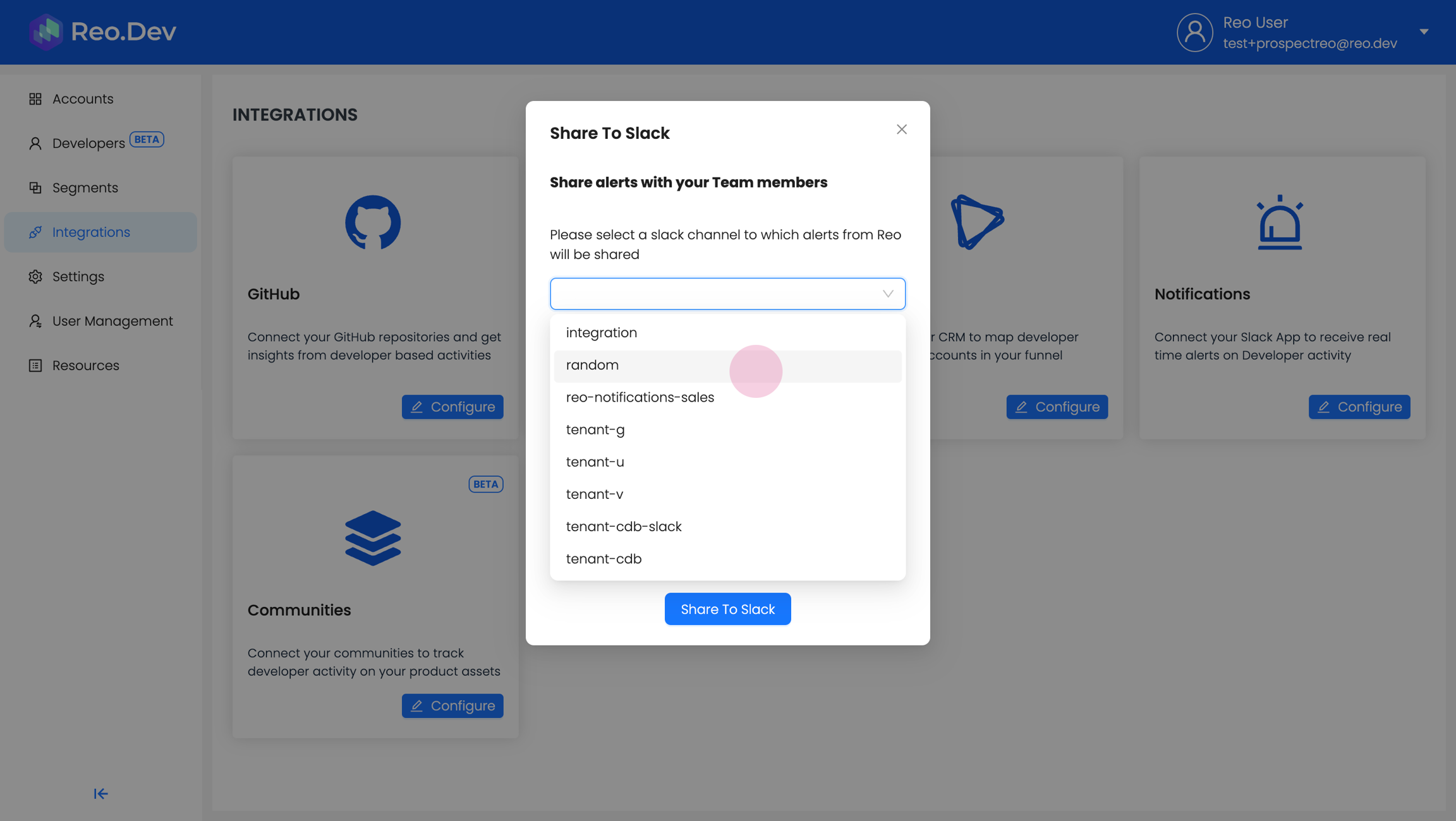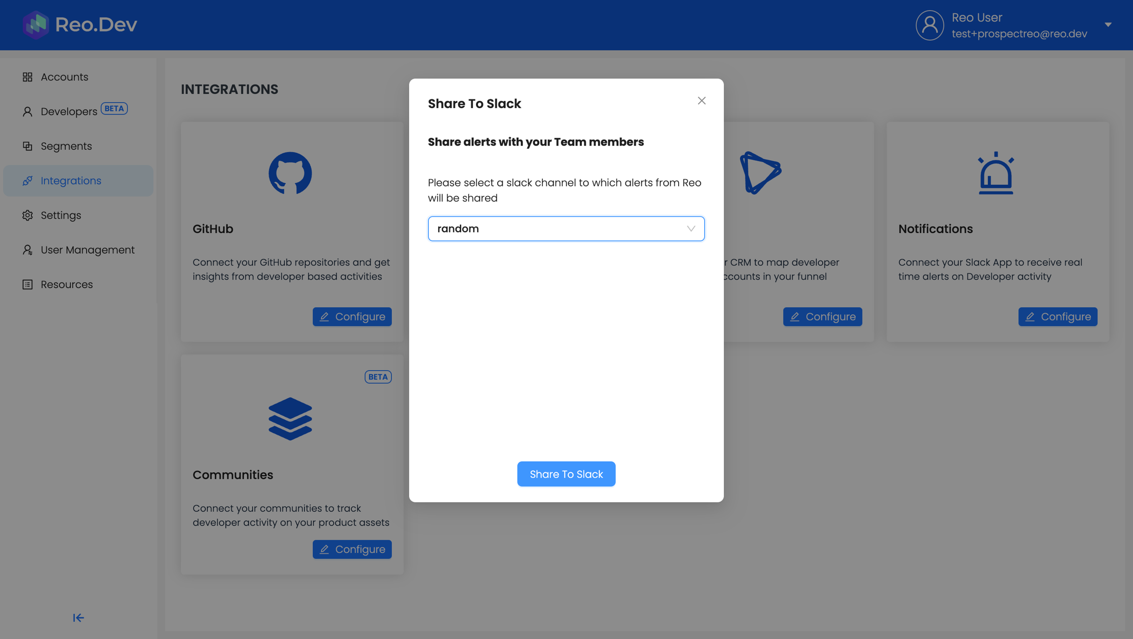 This guide explains how to integrate Reo.Dev with Slack, and set up alerts for specific developer activities in an account or segment.
