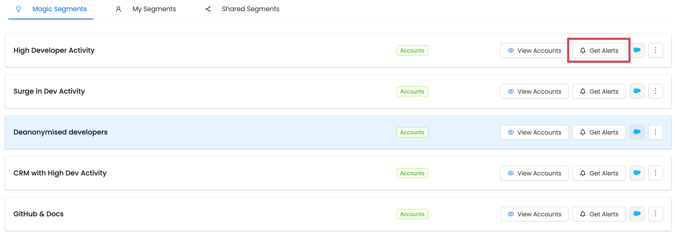 Segments: To set up notifications for a segment, click on the Get Alerts button.