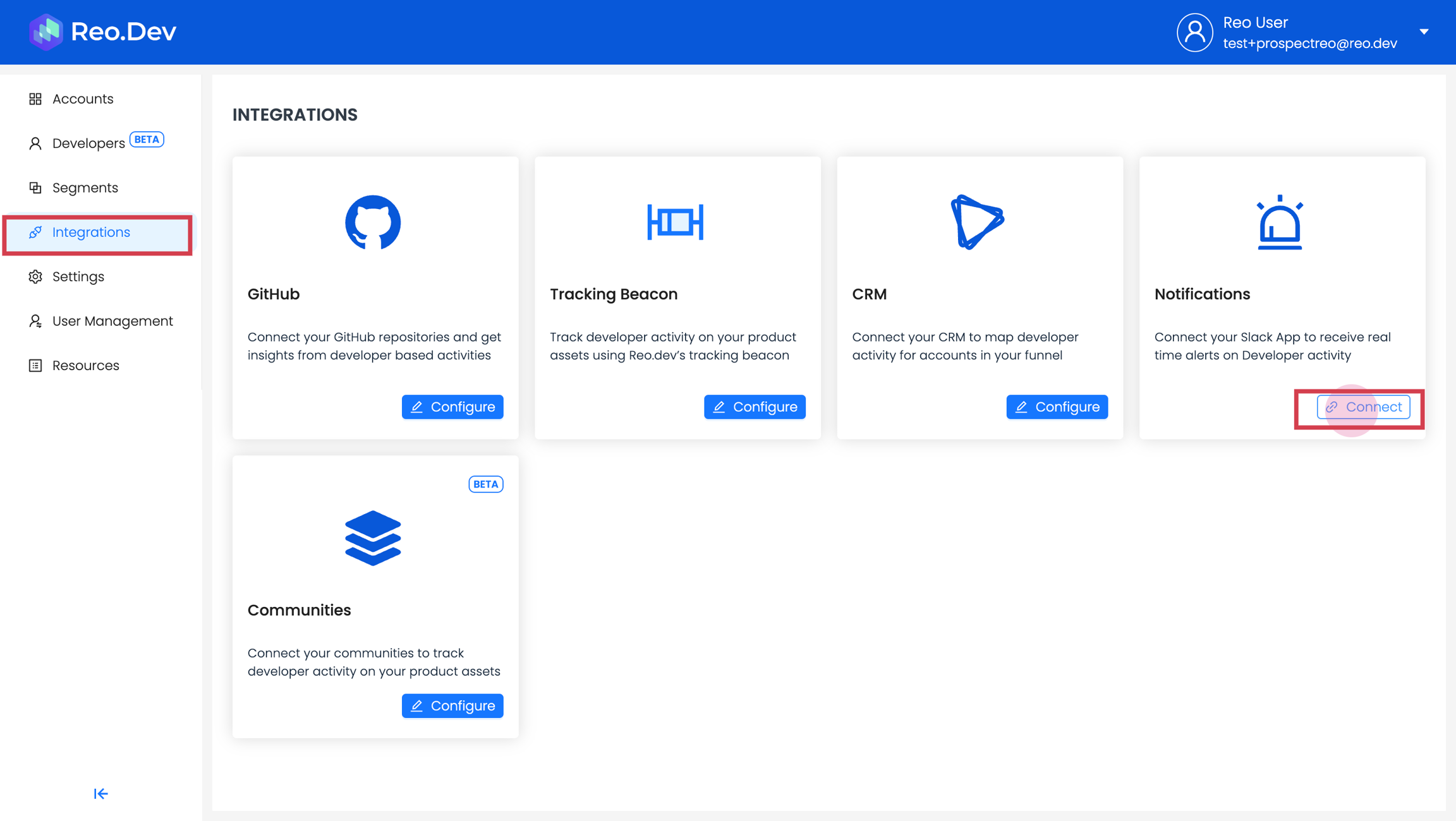 Step 1: From the Navigation bar, click Integrations and then click Connect on the notifications card.