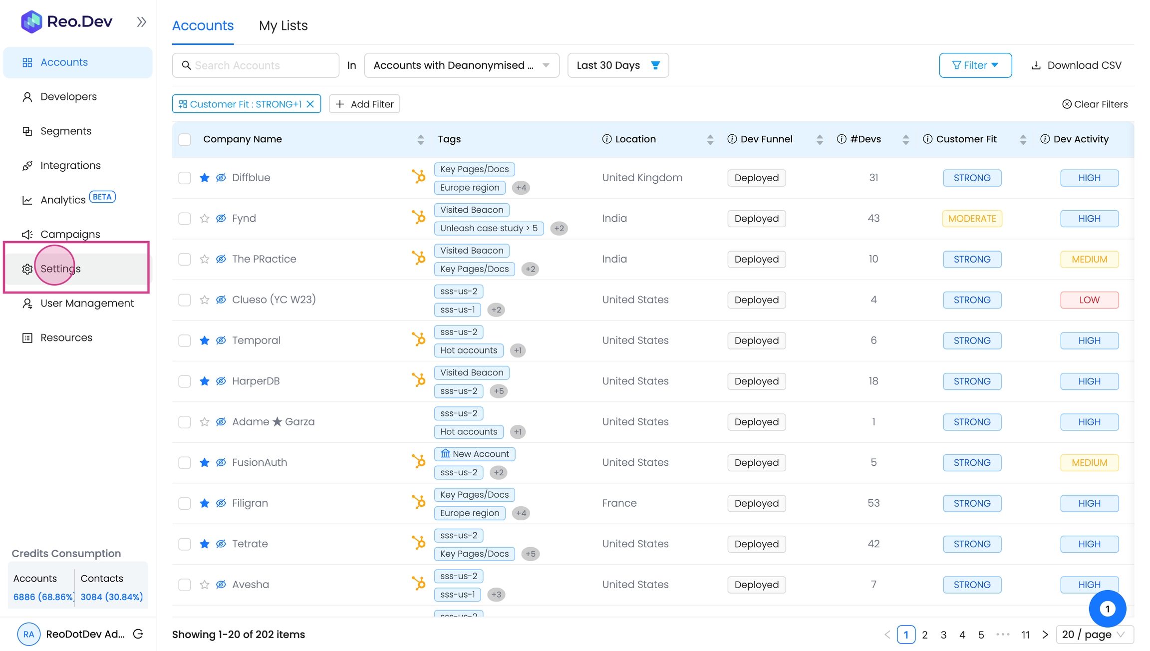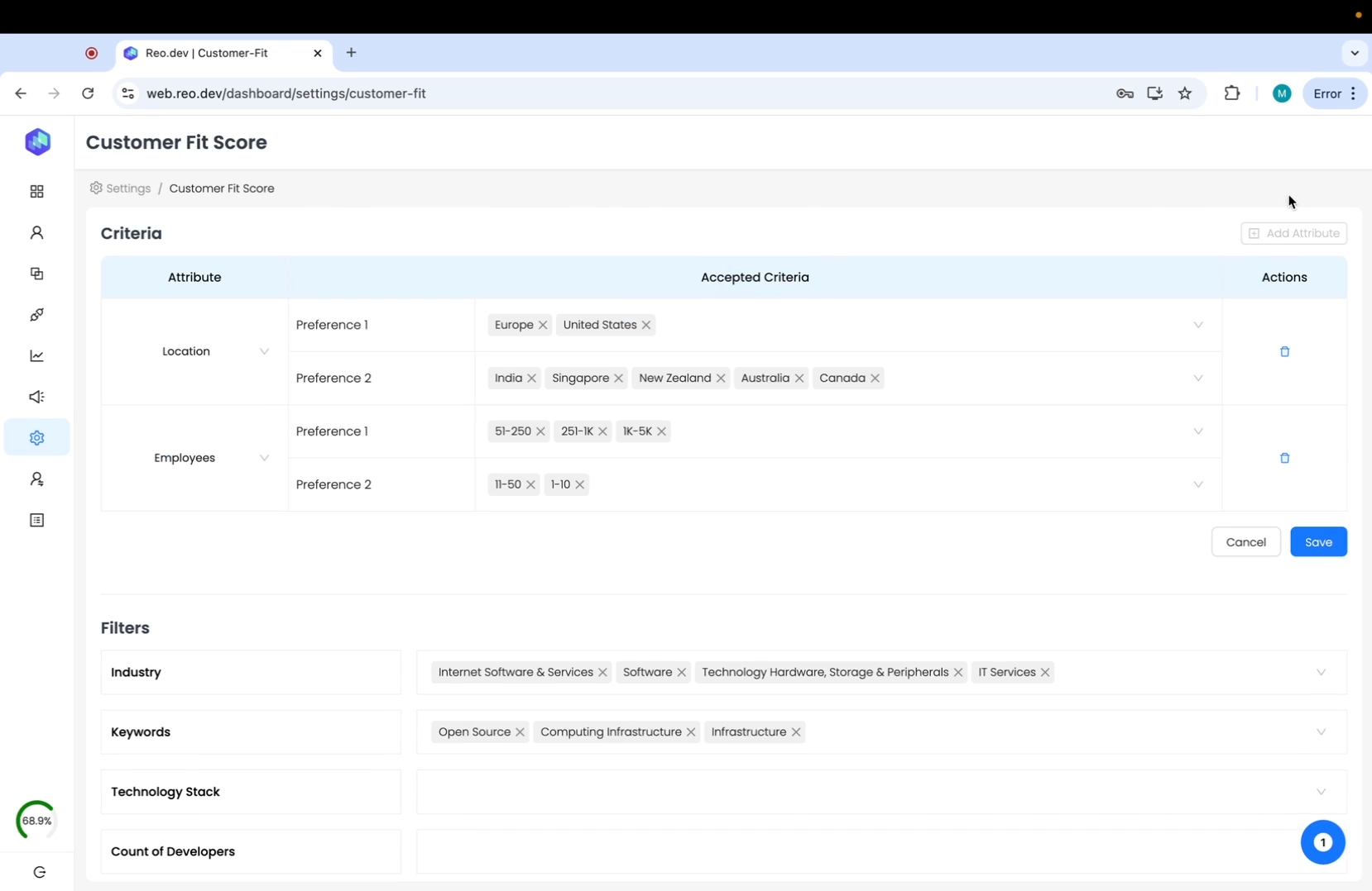 Based on these attributes, Reo.Dev assigns a Customer Fit Score to each account. This score helps you identify accounts that are strong, moderate, or weak fits.