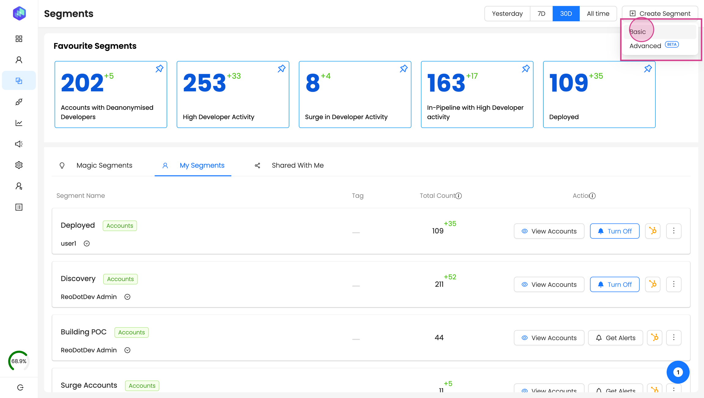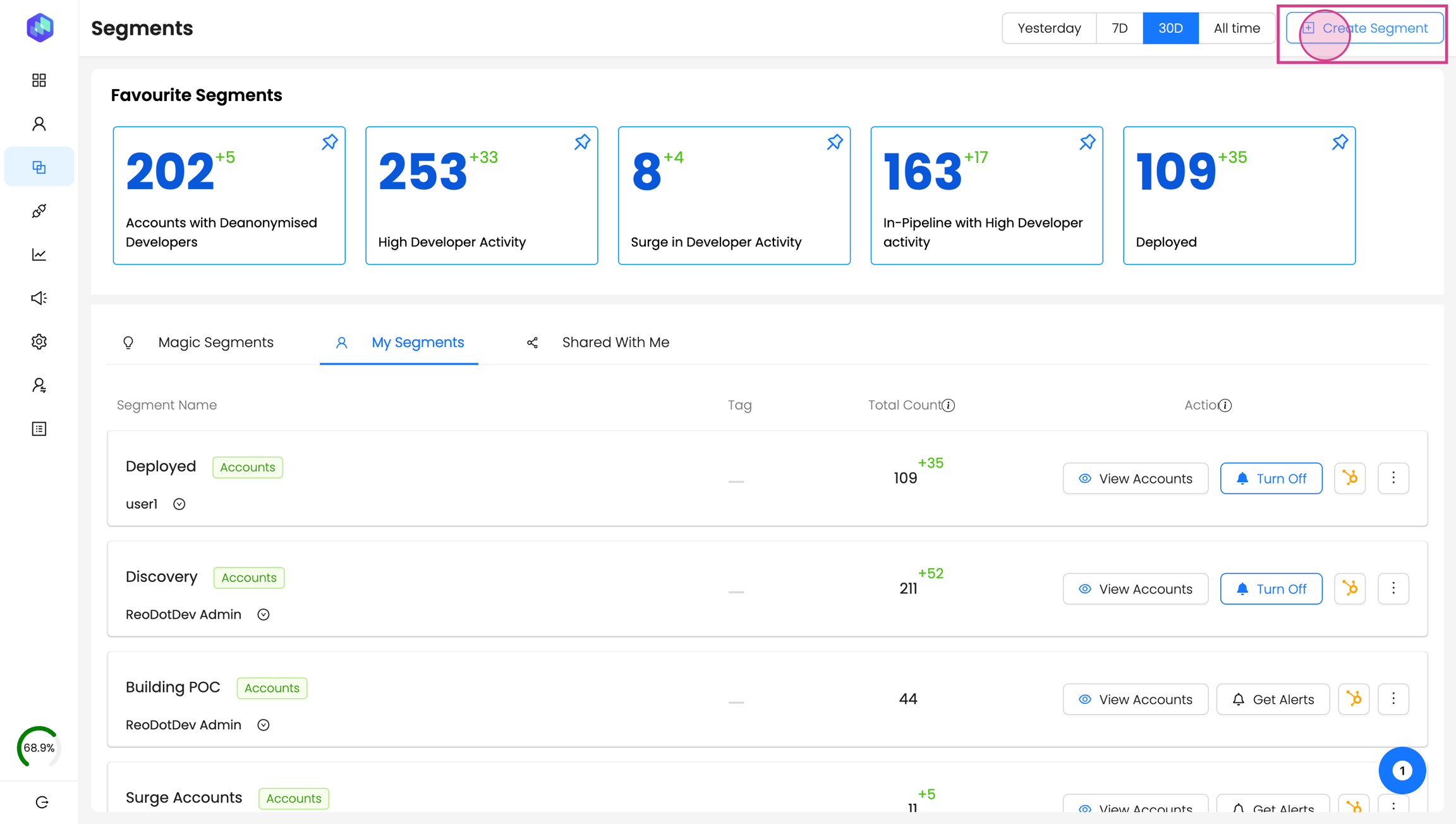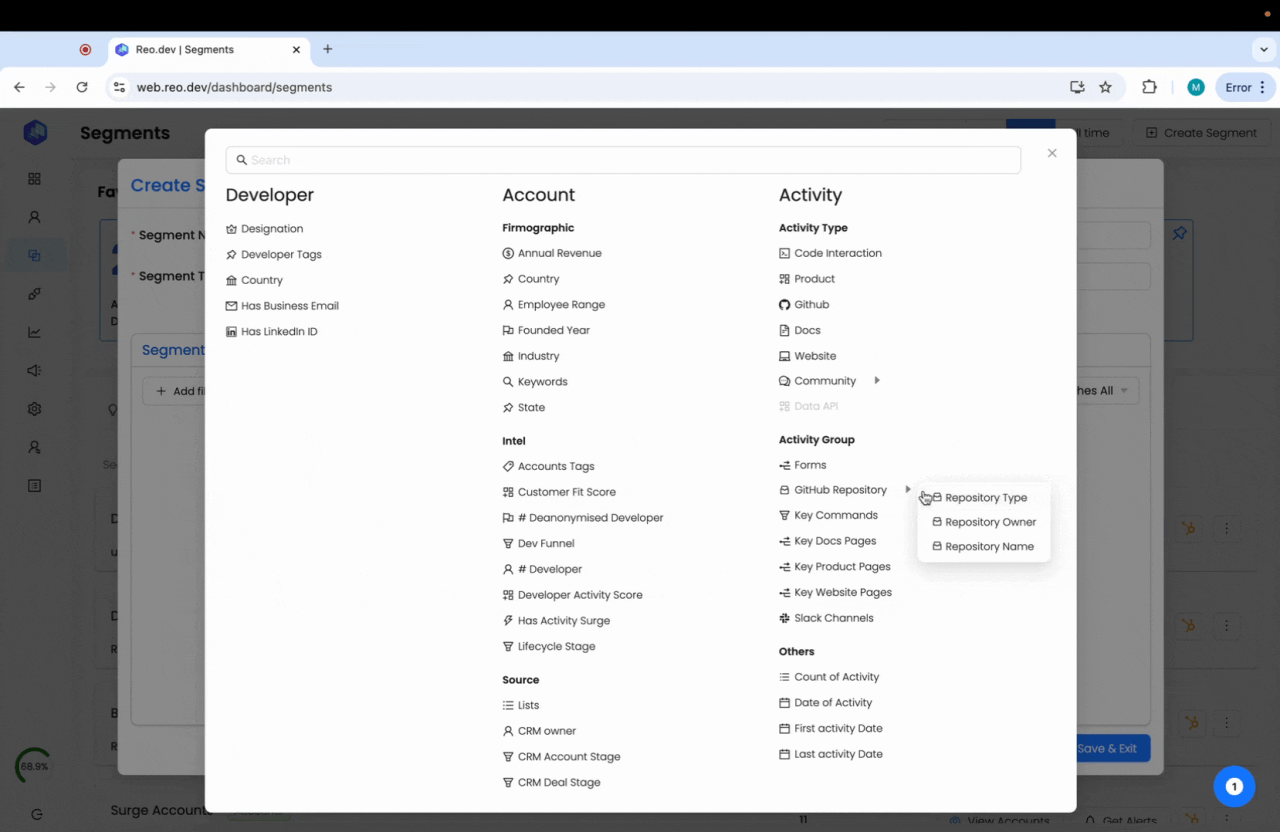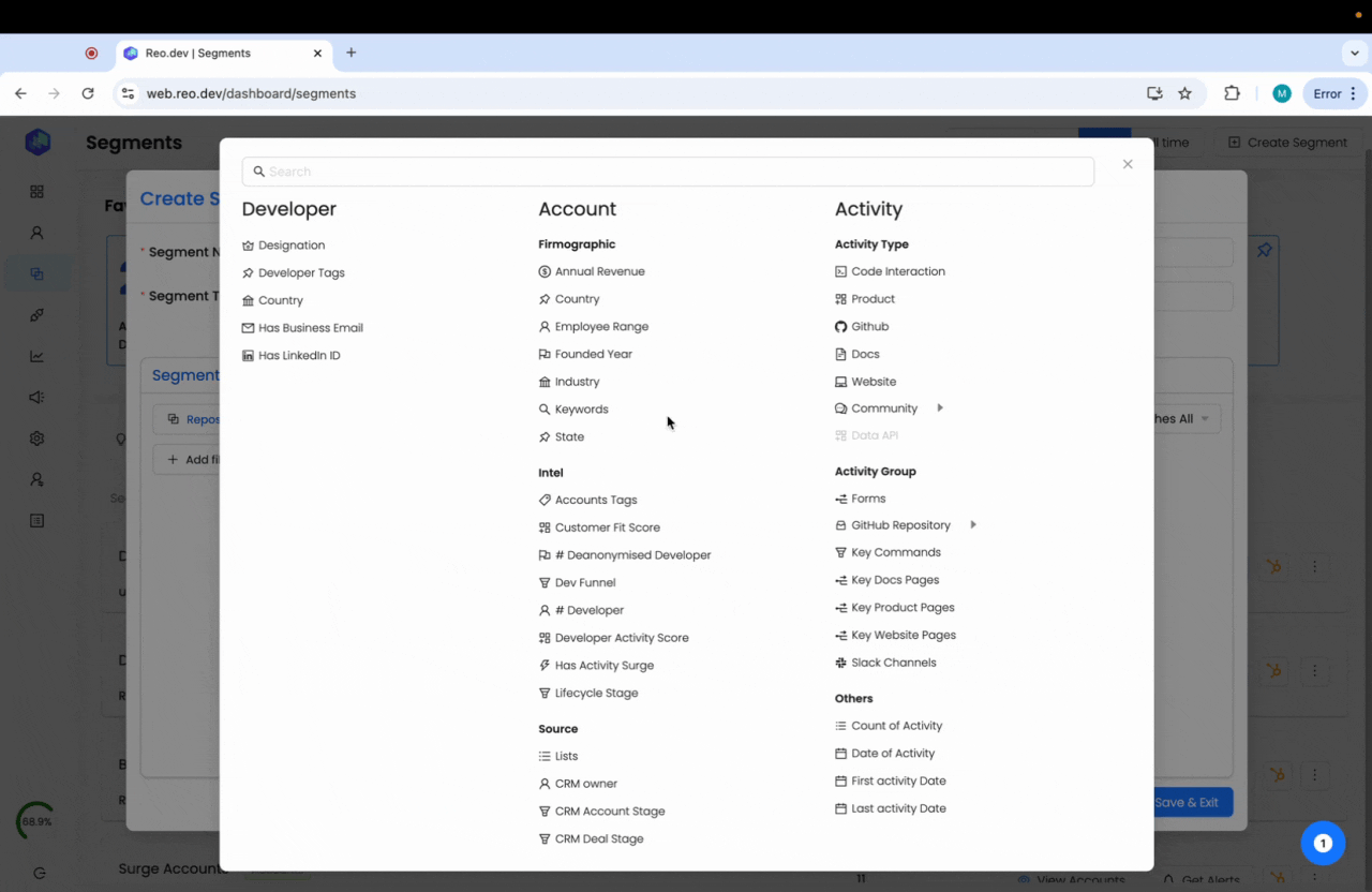 Segments in Reo.Dev are cohorts of accounts and developers categorized based on specific attributes. In this article, we will guide you on creating segments to find high-intent accounts.