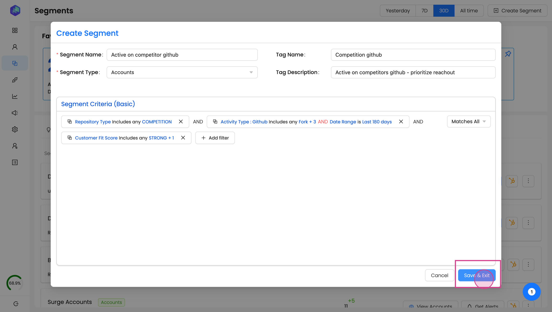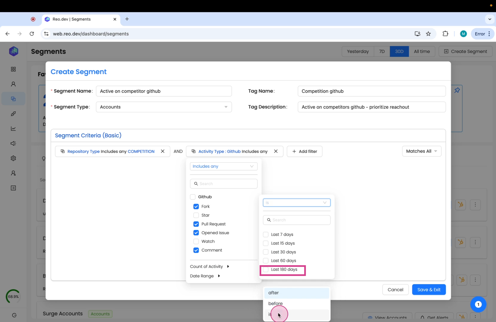 As an example - we will create a segment for accounts that have been 'Active on your competitors Github repositories'