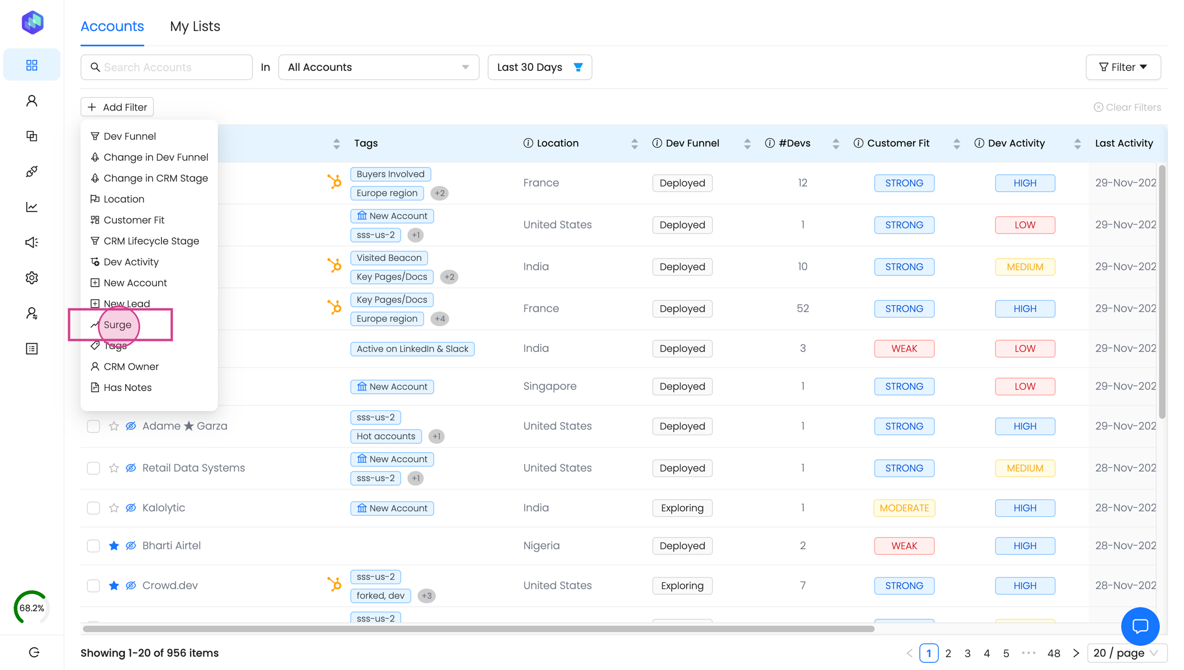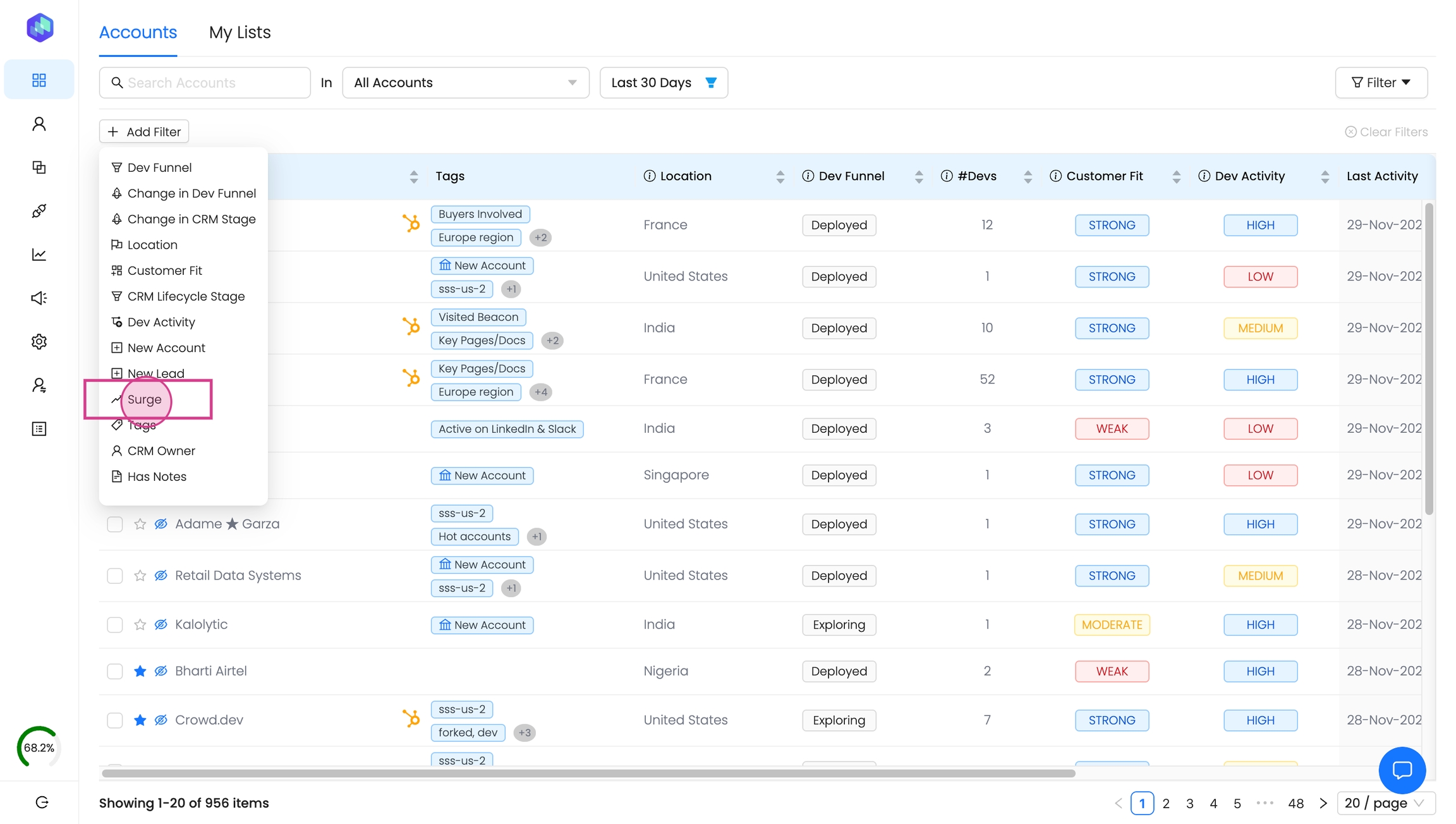 For example - you can select the 'surge' filter to identify accounts where there has been a surge in developer activity.