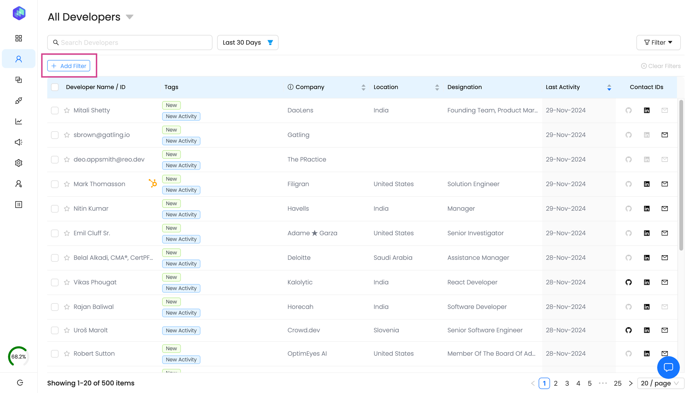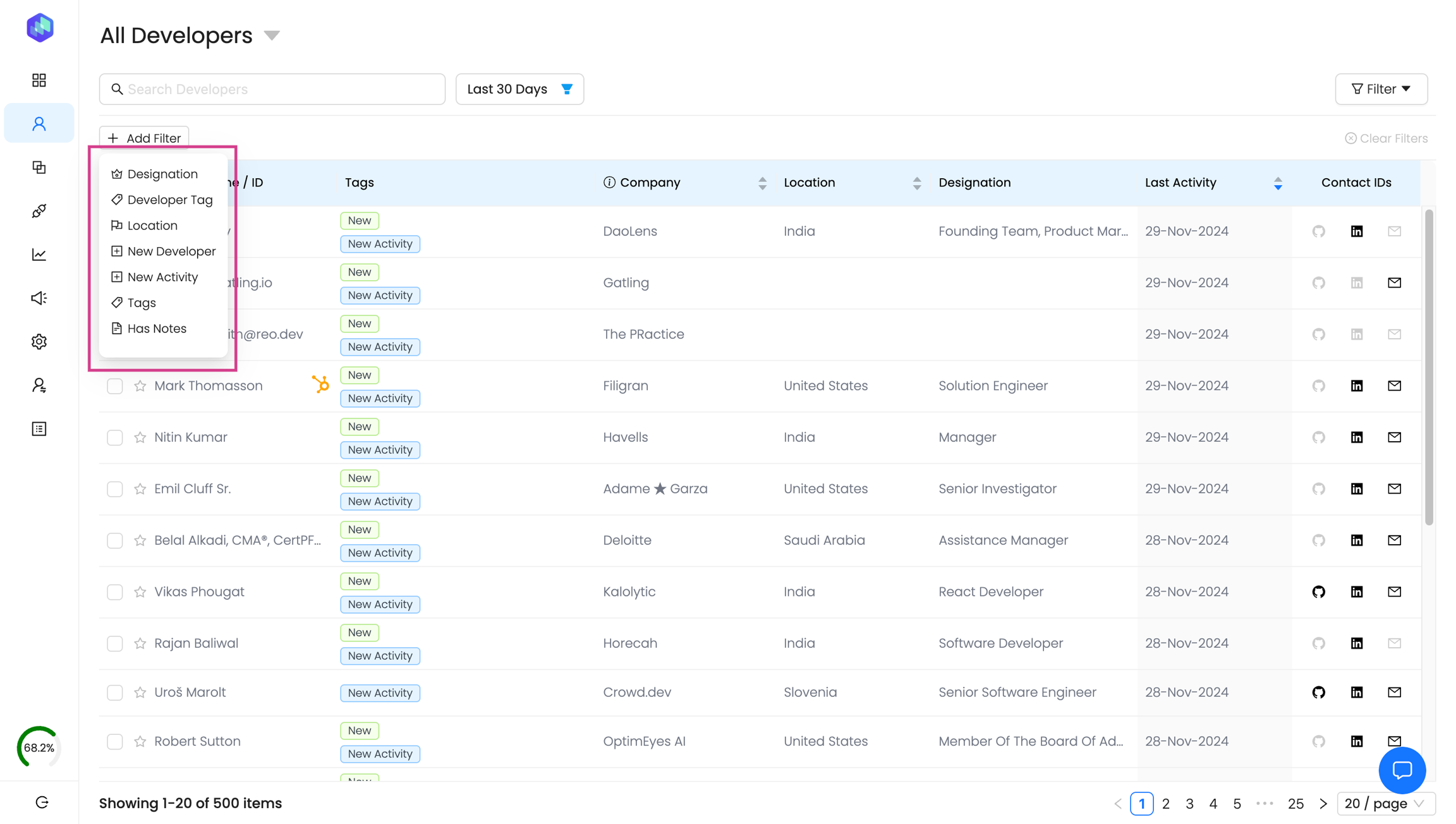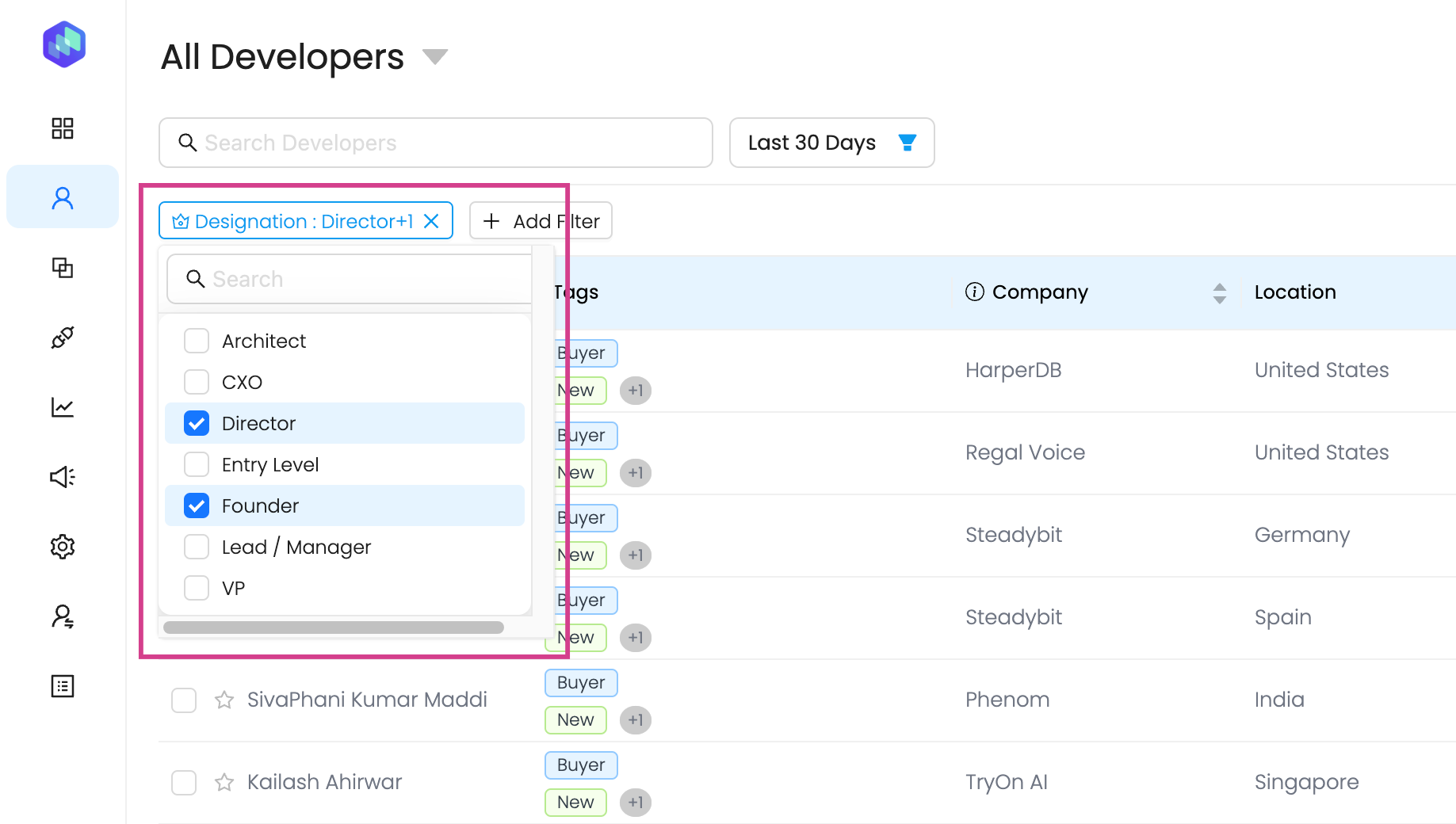 As an example - you can filter developers based on their designation. This helps you identify potential buyers.