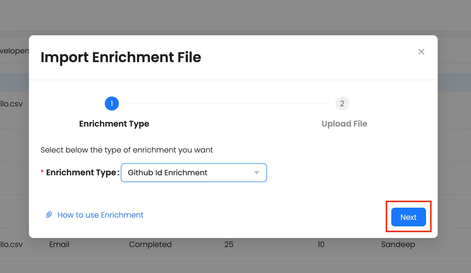 Step 4: After selecting the enrichment type, click Next to upload the file.