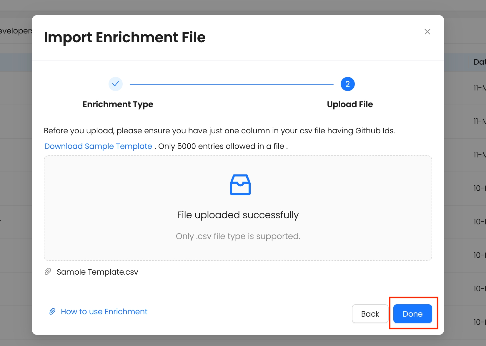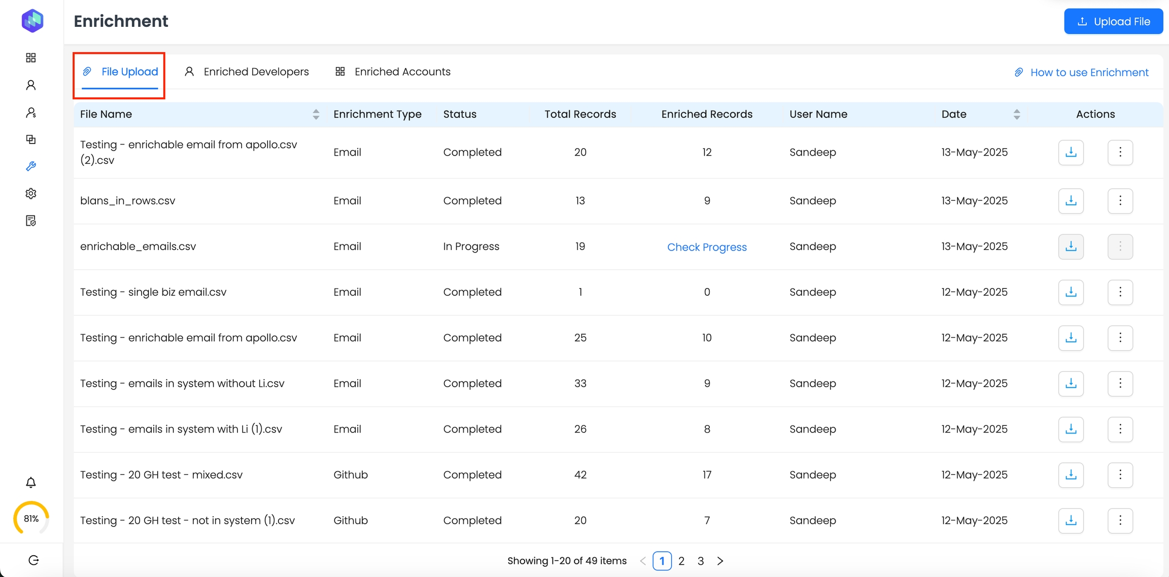 Choose the enrichment file from the drop-down menu to view all enriched developers.