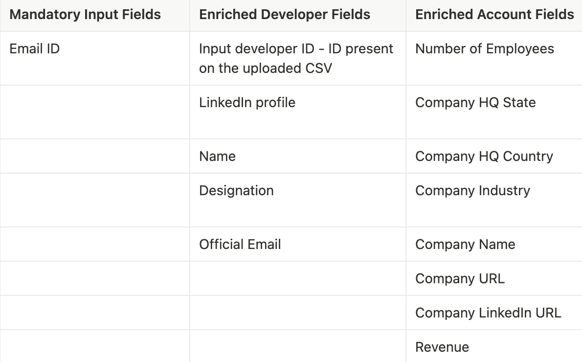 Note: There is no option to fetch just an LinkedIn or email ID. For enriched developers - if both email and LinkedIn are available, Reo.Dev will fetch both by default.