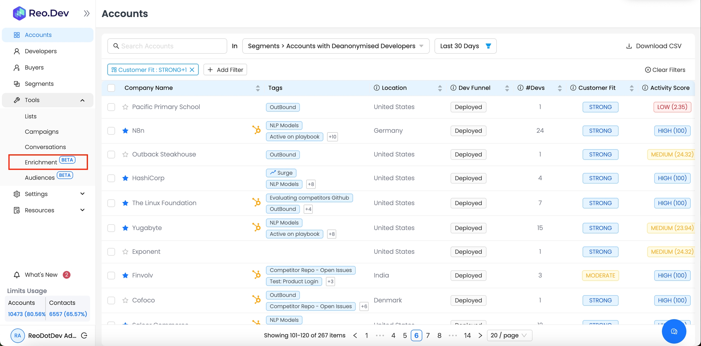 Similar to the enriched developers tab, the enriched accounts tab shows a list of all enriched accounts.