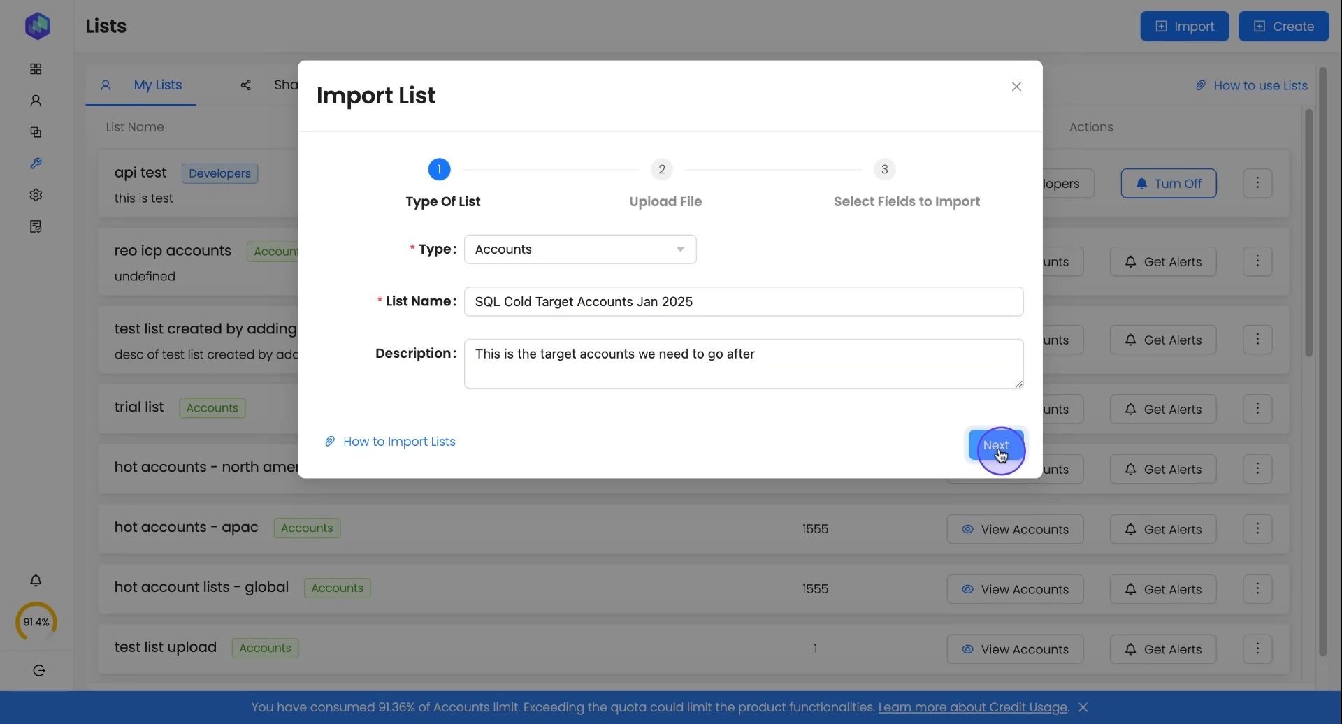 Choose the custom list (e.g., SQL Cold Target Accounts - Jan 2025)
