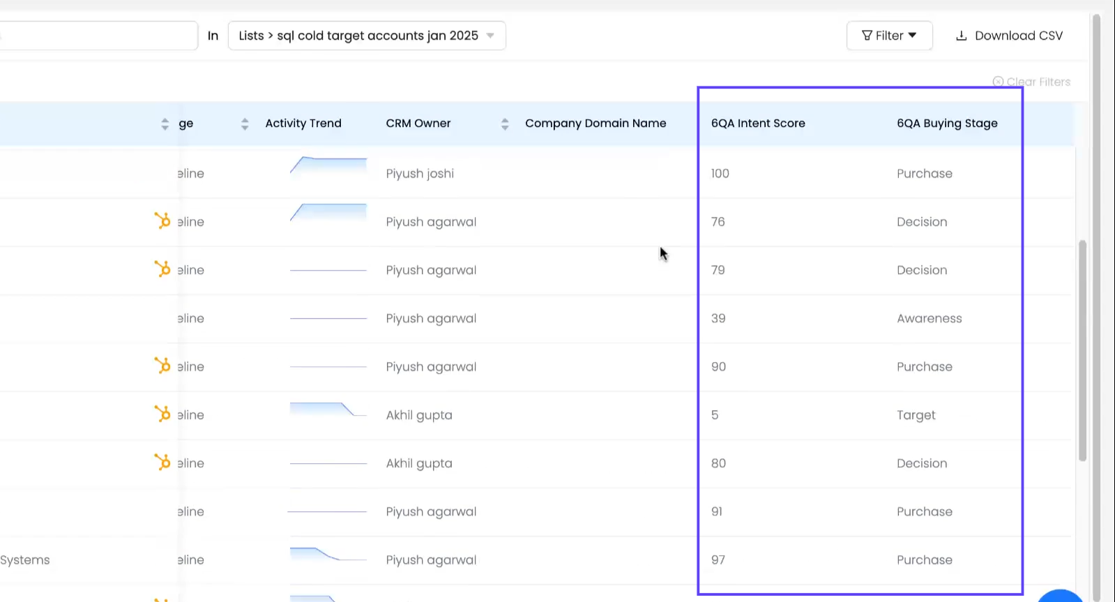 A Sales Manager uploads a list of 100 accounts. After enrichment with Reo.Dev data, they filter high-intent accounts.