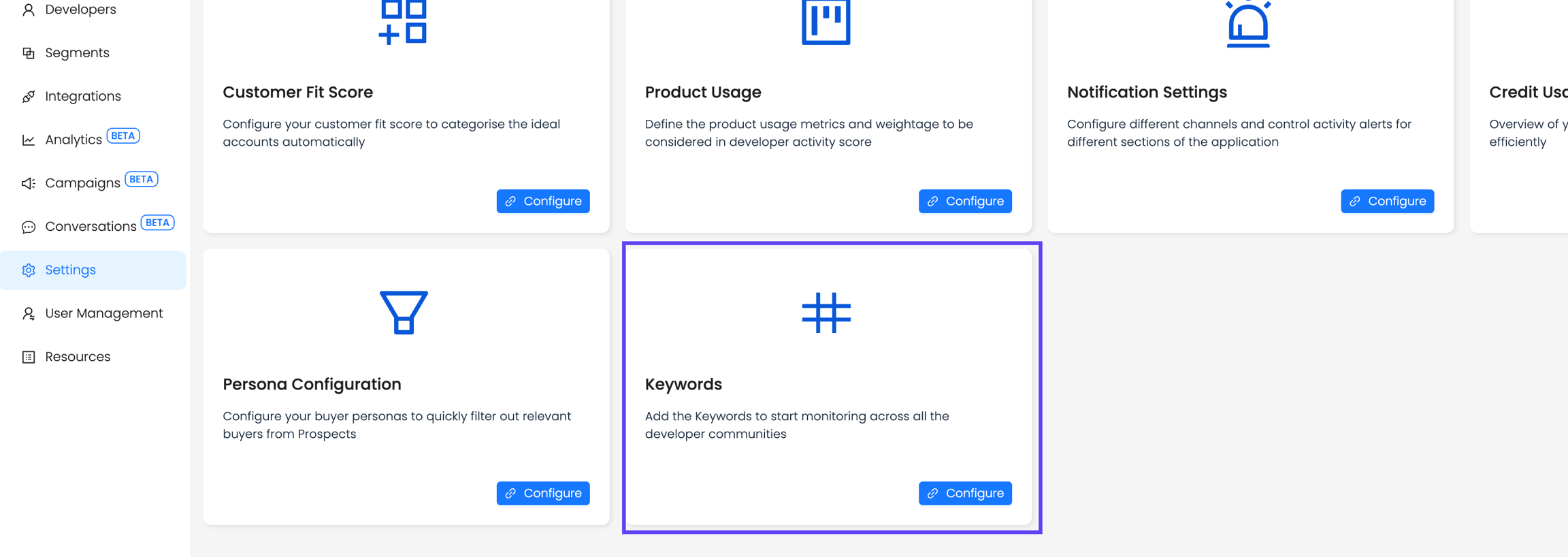 Set up and manage keywords to track specific topics or discussions in the Settings panel.