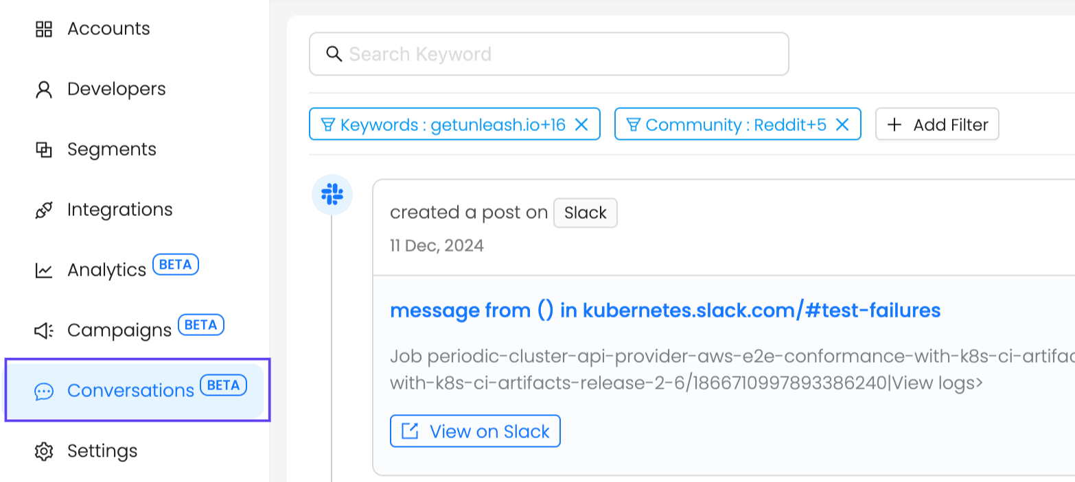 Go to the Conversations tab to view results for the configured keywords.