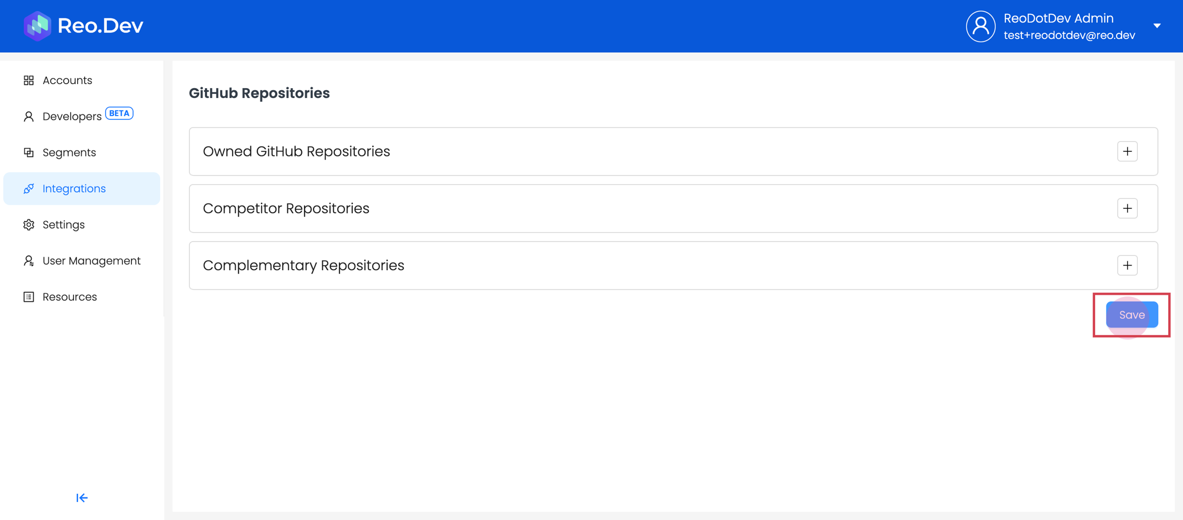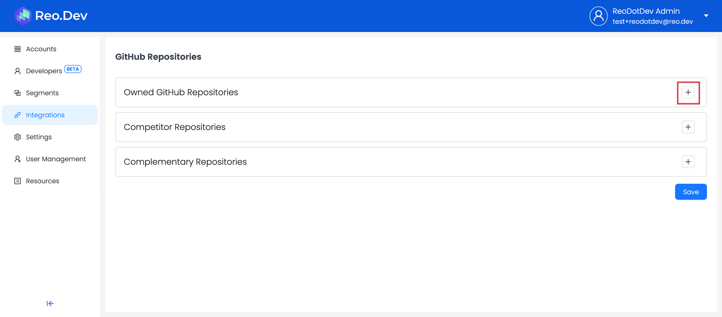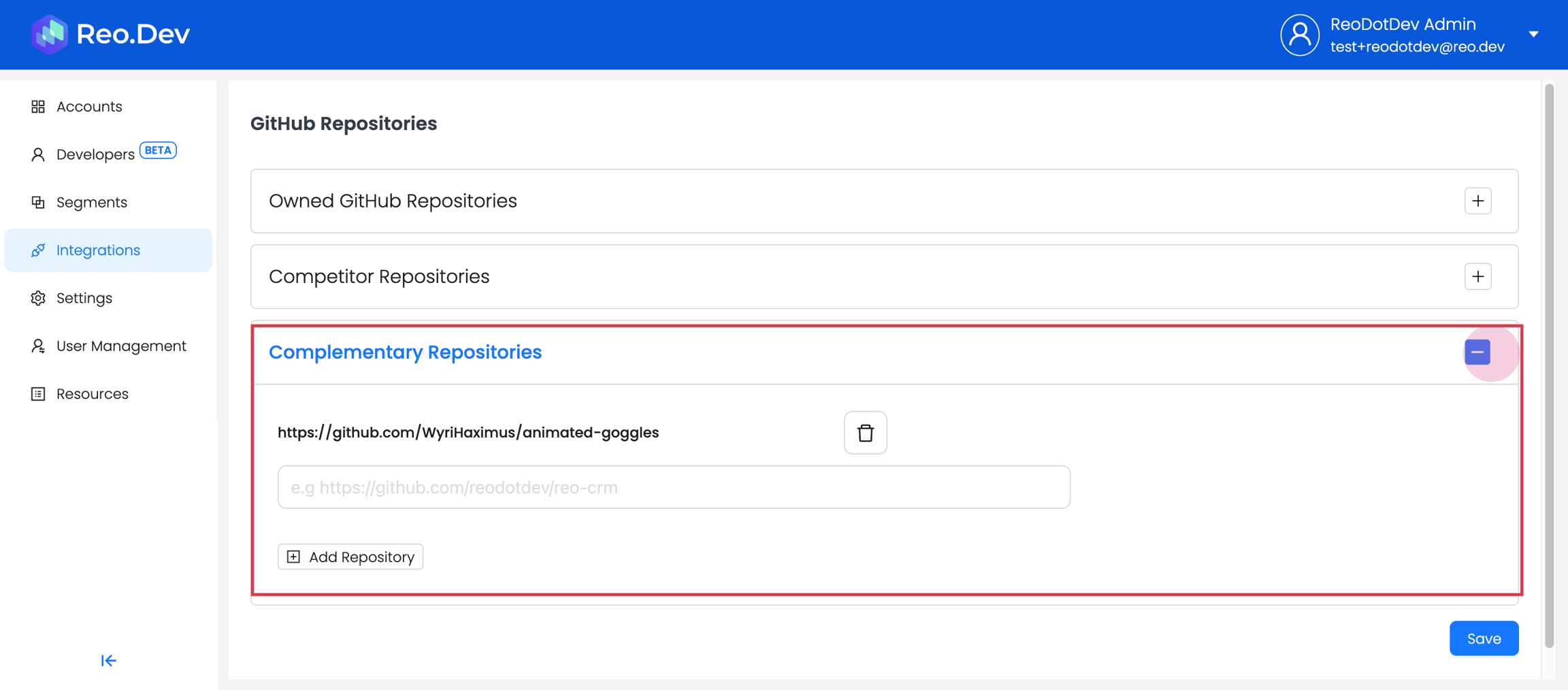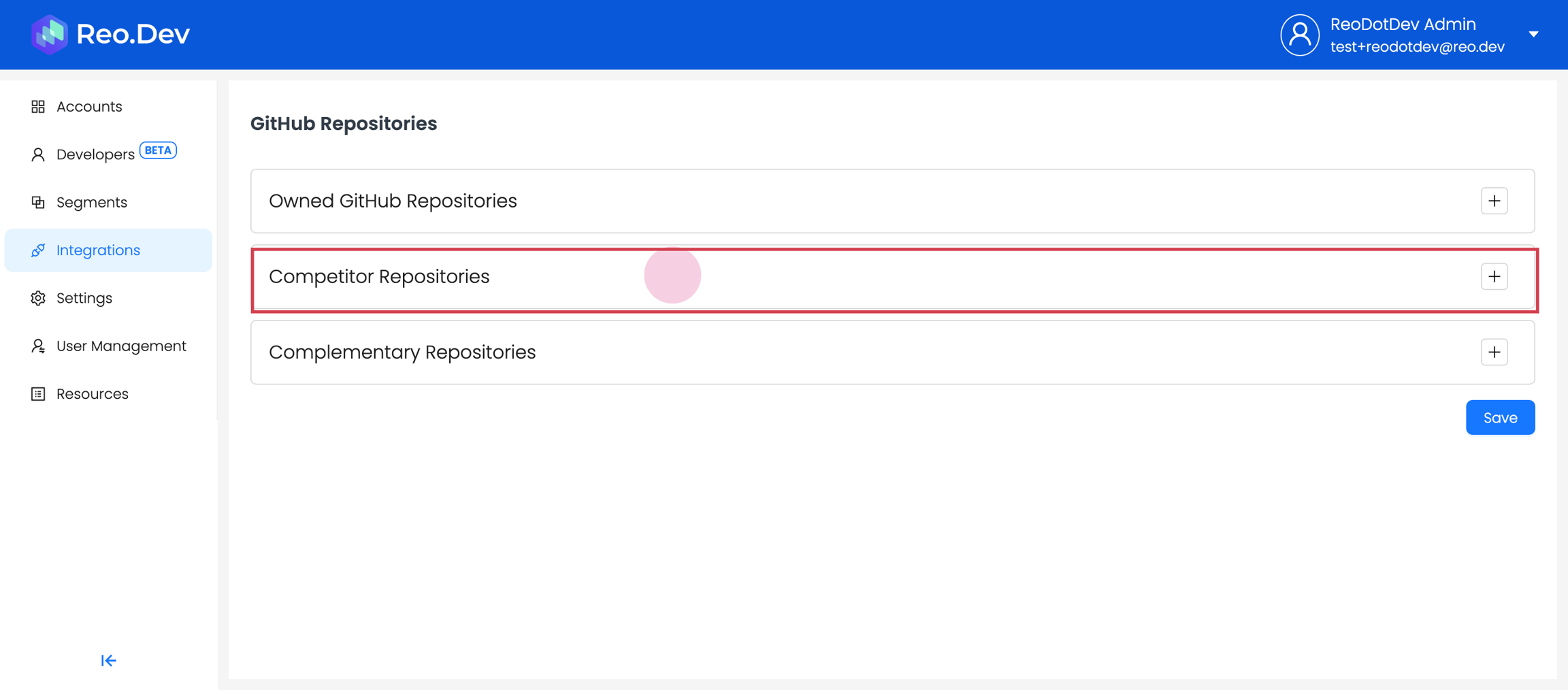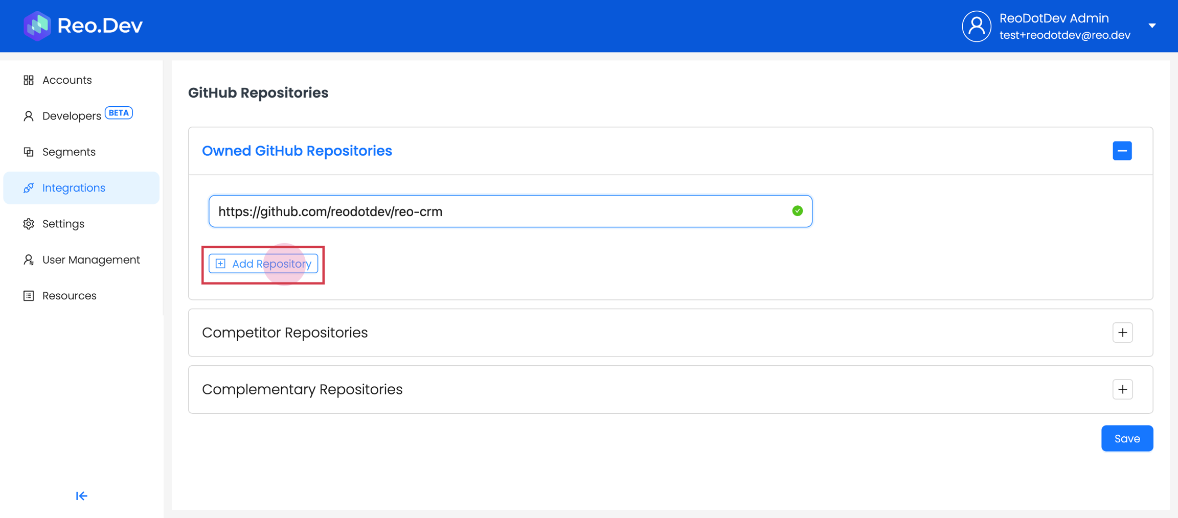 Along with connecting your own repository, you can also connect competitors' and complementary repositories. Reo.Dev will then track developer activities across all these repositories.