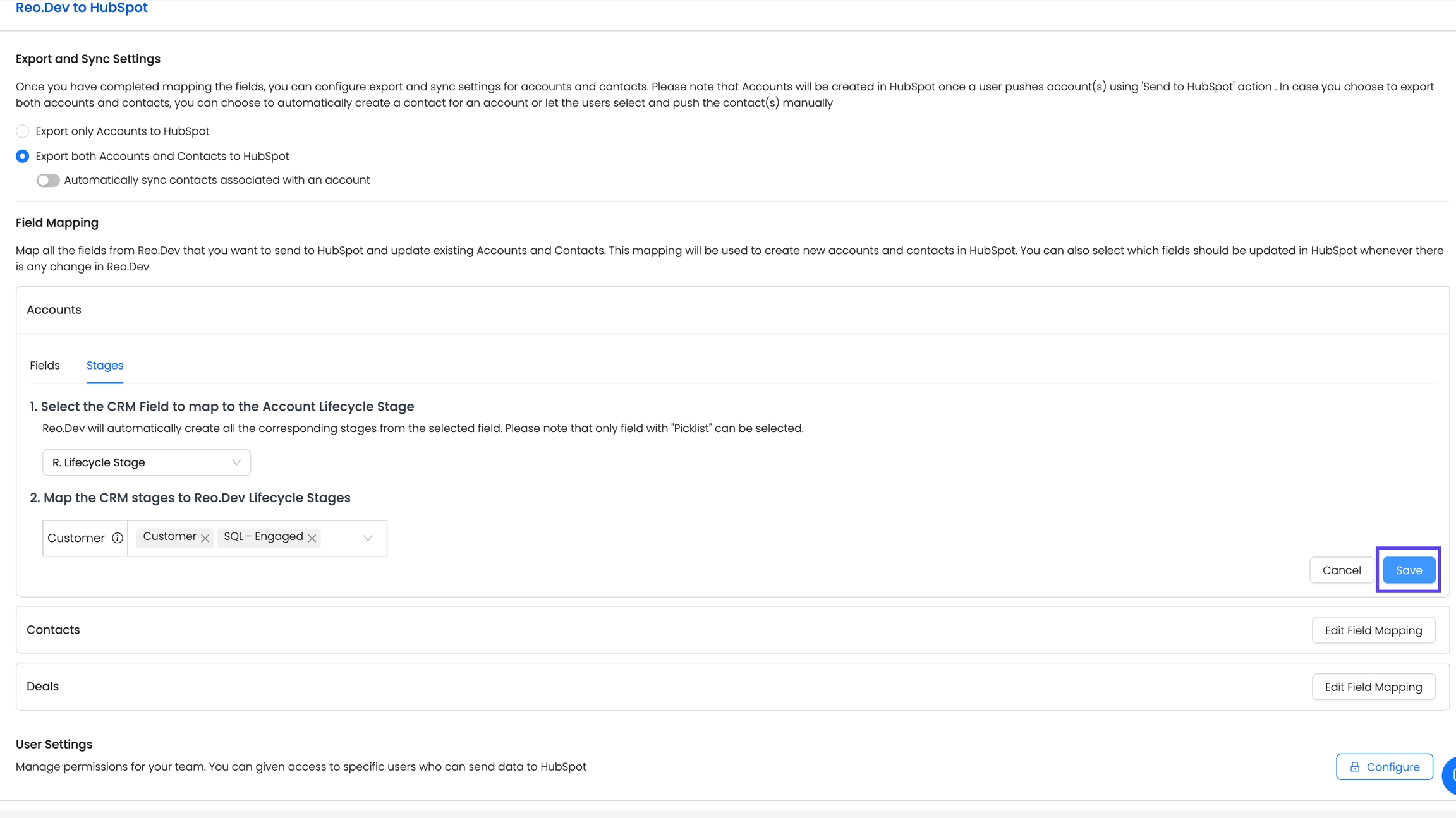 Map all the fields from Reo.Dev that you want to send to HubSpot and update existing Accounts and Contacts. This mapping will be used to create new accounts and contacts in HubSpot. You can also select which fields should be updated in HubSpot whenever there is any change in Reo.Dev.