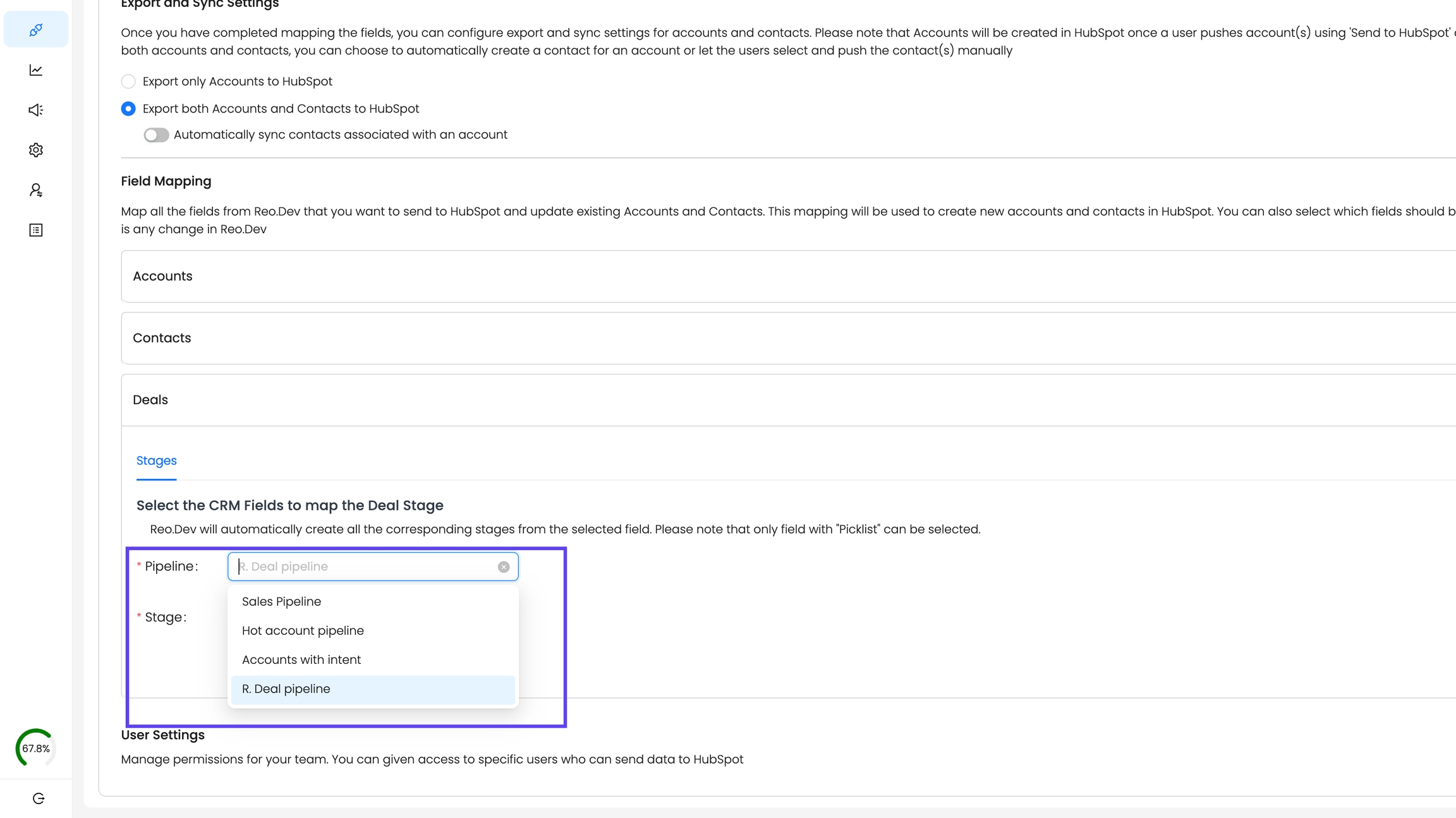 Select a Pipeline from the dropdown, as HubSpot supports custom pipelines tied to deal stages.
